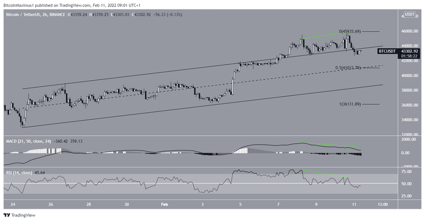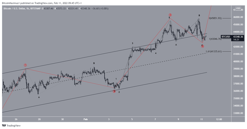 Da der Bitcoin Preis am 10. Februar kontinuierlich gefallen ist, könnte die Kursstruktur die Gestalt einer Flat-Correction annehmen. Die A- und die C-Welle hatten außerdem ein nahezu exaktes 1:1-Verhältnis, das man häufig bei solchen Strukturen sieht. Die nächsten beiden Wellen könnten ein 1:1.61-Verhältnis aufweisen. In diesem Fall würde der BTC Preis auf 41.335 USD fallen, der sich in der Nähe der Mittellinie des Kanals und des zuvor erwähnten 0.5-Fib-Retracement-Support-Levels befindet.