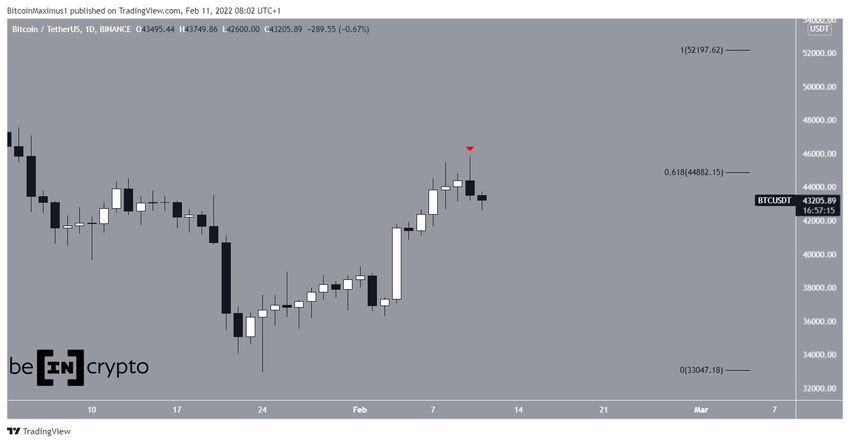 Am 10. Februar 2022 stieg der Bitcoin Kurs auf das Tageshoch bei 45.821 USD an, bevor er dann gefallen ist. Der Hochpunkt lag etwas über dem 0.618-Fib-Retracement-Level (44.900 USD). Dieses Level ist meist eine Schranke für einen Trendwechsel.