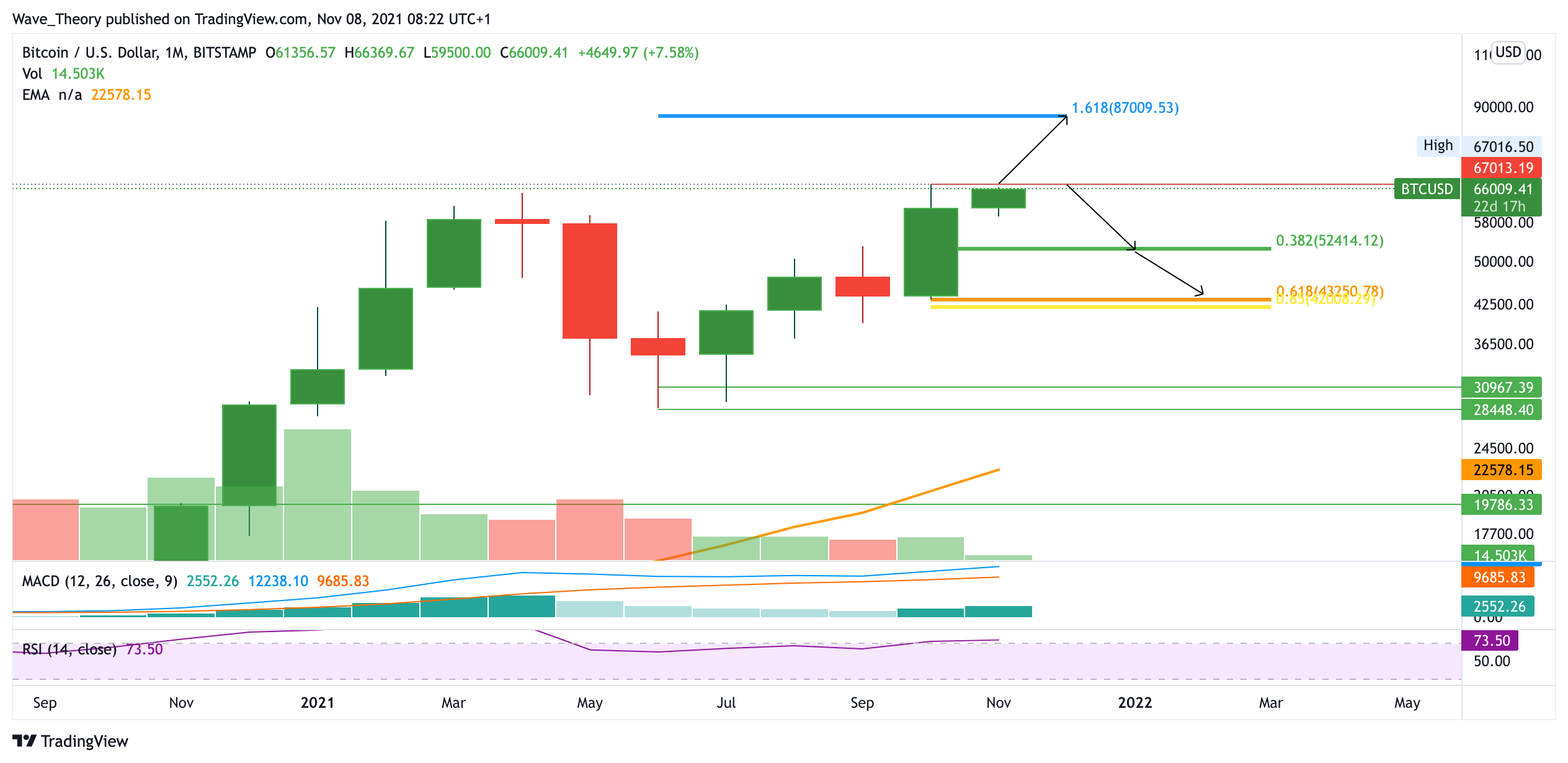 Tritt jedoch der Fall ein, dass Bitcoin am Allzeithoch bärisch abgewiesen wird, findet er spätestens bei 52.000 USD und bei 43.000 USD starke Unterstützung. Sofern sich der BTC Preis über diesen Niveaus hält, bleibt der Trend stark bullisch.