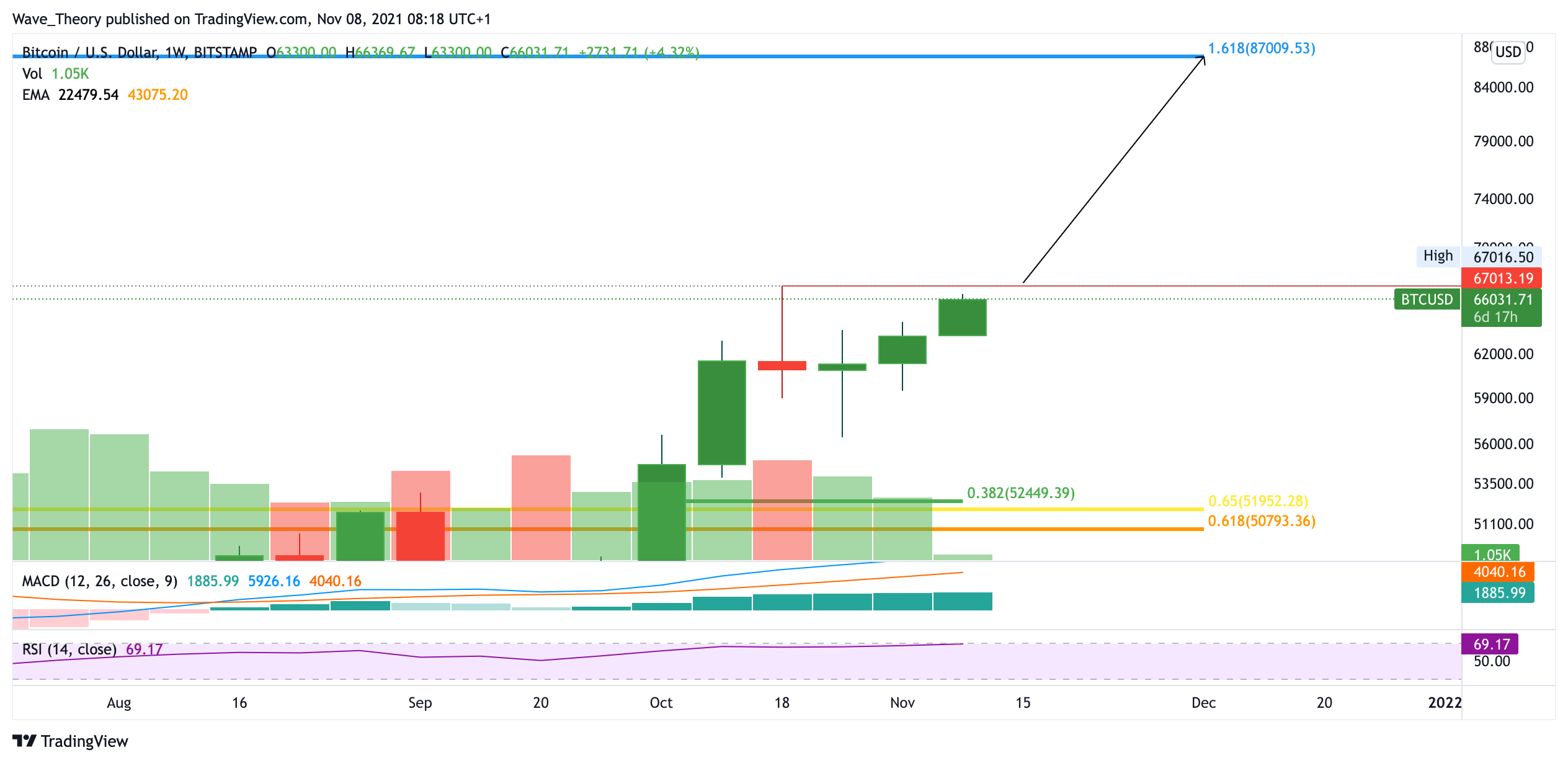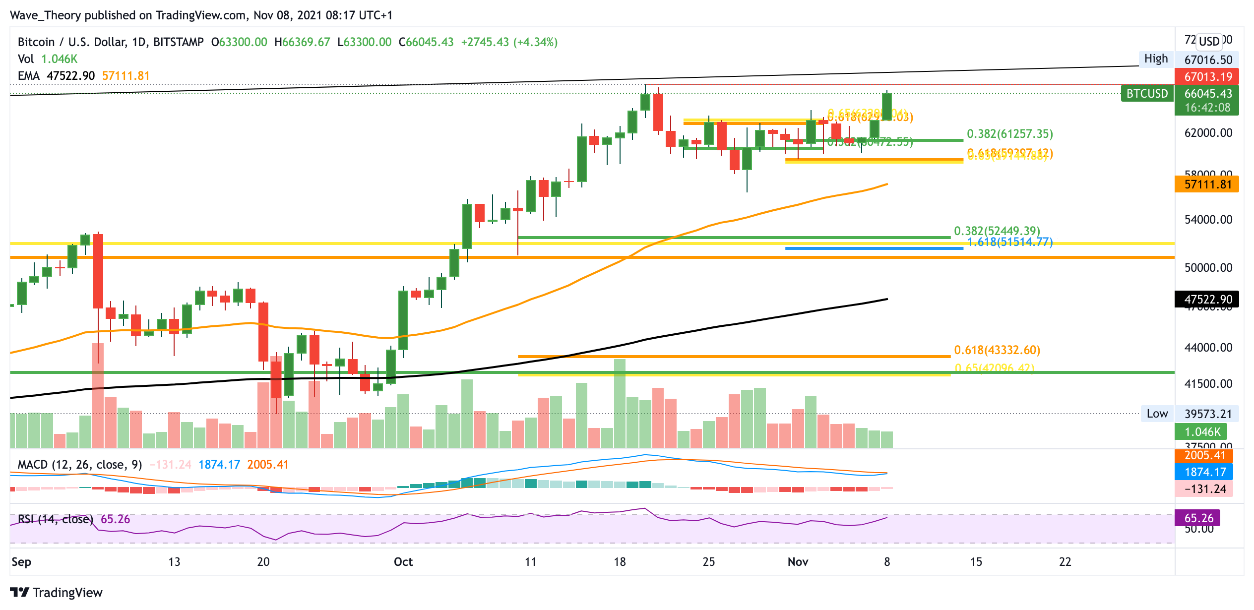 Der Bitcoin Kurs konnte letzte Woche bullisch beenden und beginnt die neue Woche noch bullischer. Dabei konnte der BTC Kurs den Golden Ratio Widerstand bei rund 63.000 USD brechen und ist mit derzeit 66.000 USD nur noch wenige Dollar entfernt vom Allzeithoch bei rund 67.000 USD. Auch der MACD zeigt sich im Tageskurs wieder bullisch und wenn Bitcoin 67.000 USD hinter sich lässt, steht ein bullischer Ausbruch vor der Tür.