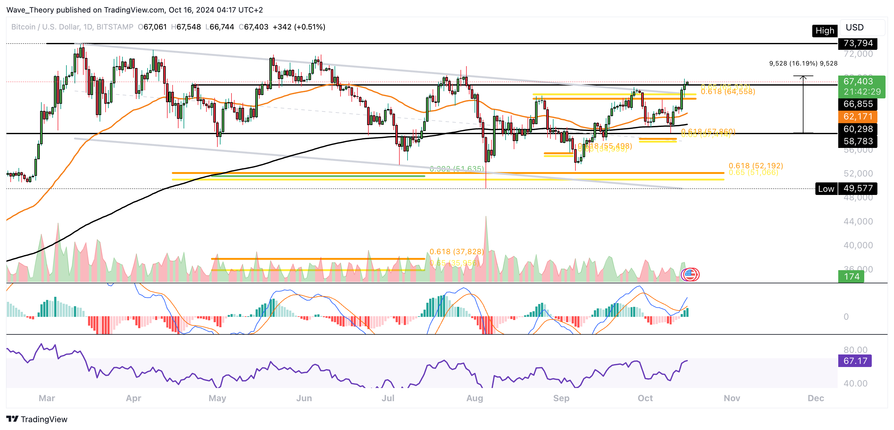 Dann könnte der Bitcoin Kurs aus dem parallelen Abwärtskanal ausbrechen und das ATH bei rund 73.800 USD anvisieren. Insgesamt konnte Bitcoin seit dem Abpraller an der wichtigen Golden Ratio Unterstützung bei rund 52.000 USD rund 37 % steigen.