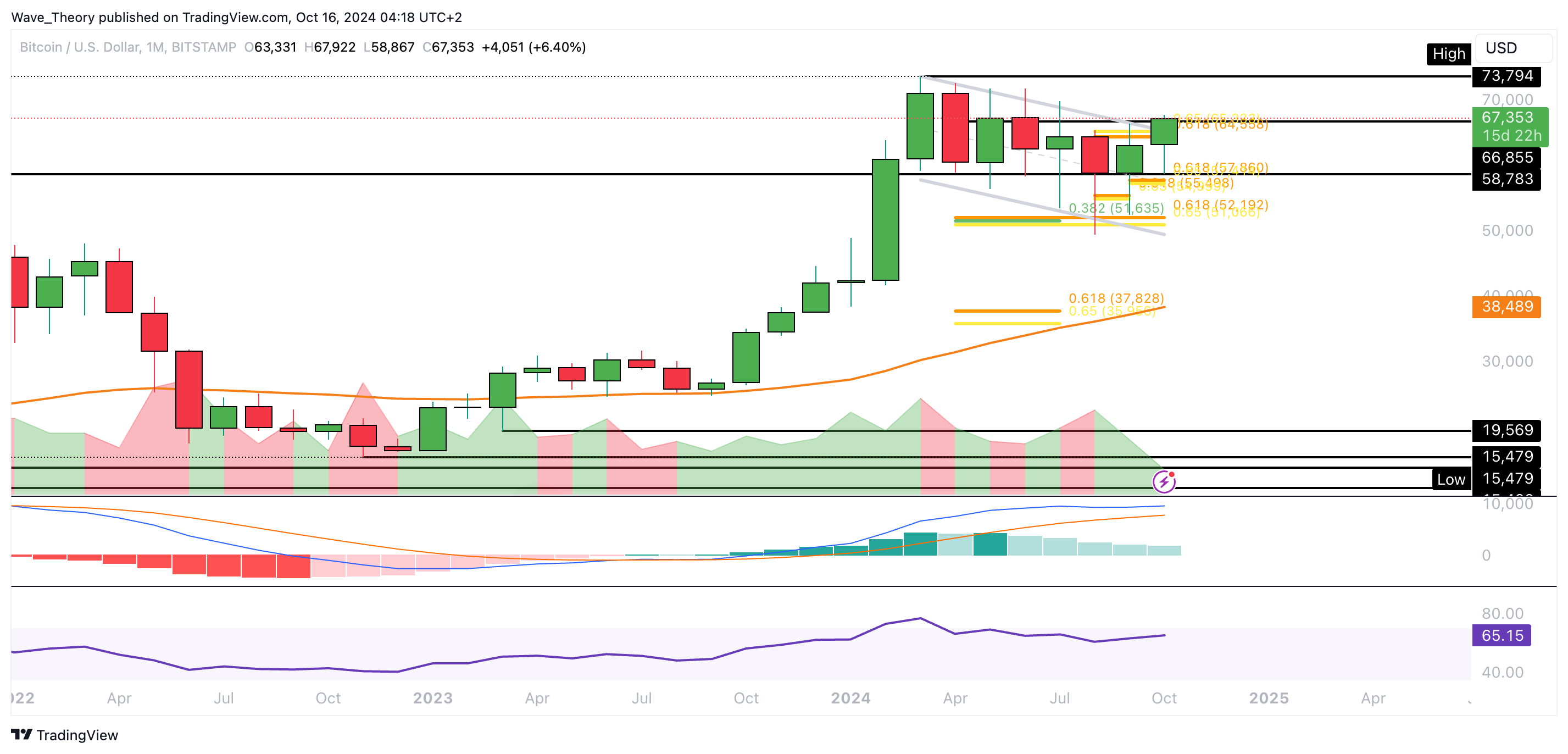 Bitcoin sollte also unbedingt über 70.000 USD steigen, um den Aufwärtstrend zu bestätigen. Das Histogramm des MACDs zeigt sich im Monatschart hingegen immer noch bärisch.