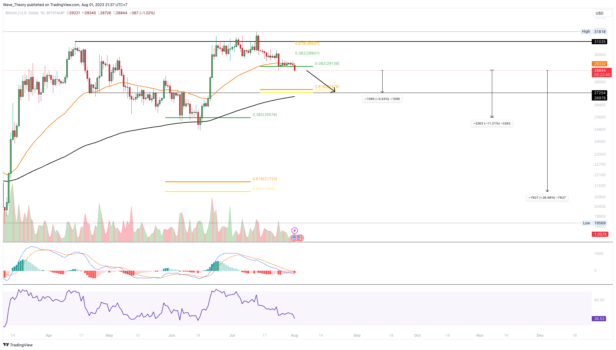 Der Bitcoin Kurs hat die 0,382 Fib Unterstützung bei rund 29.140 USD jetzt bärisch gebrochen. Damit könnte der Kurs jetzt zur Golden Ratio Unterstützung bei rund 27.250 USD korrigieren. Das impliziert ein Abwärtspotenzial von rund 5,5 %. Dort angekommen, könnte der Kurs stark abprallen, um die Aufwärtsbewegung fortzusetzen.