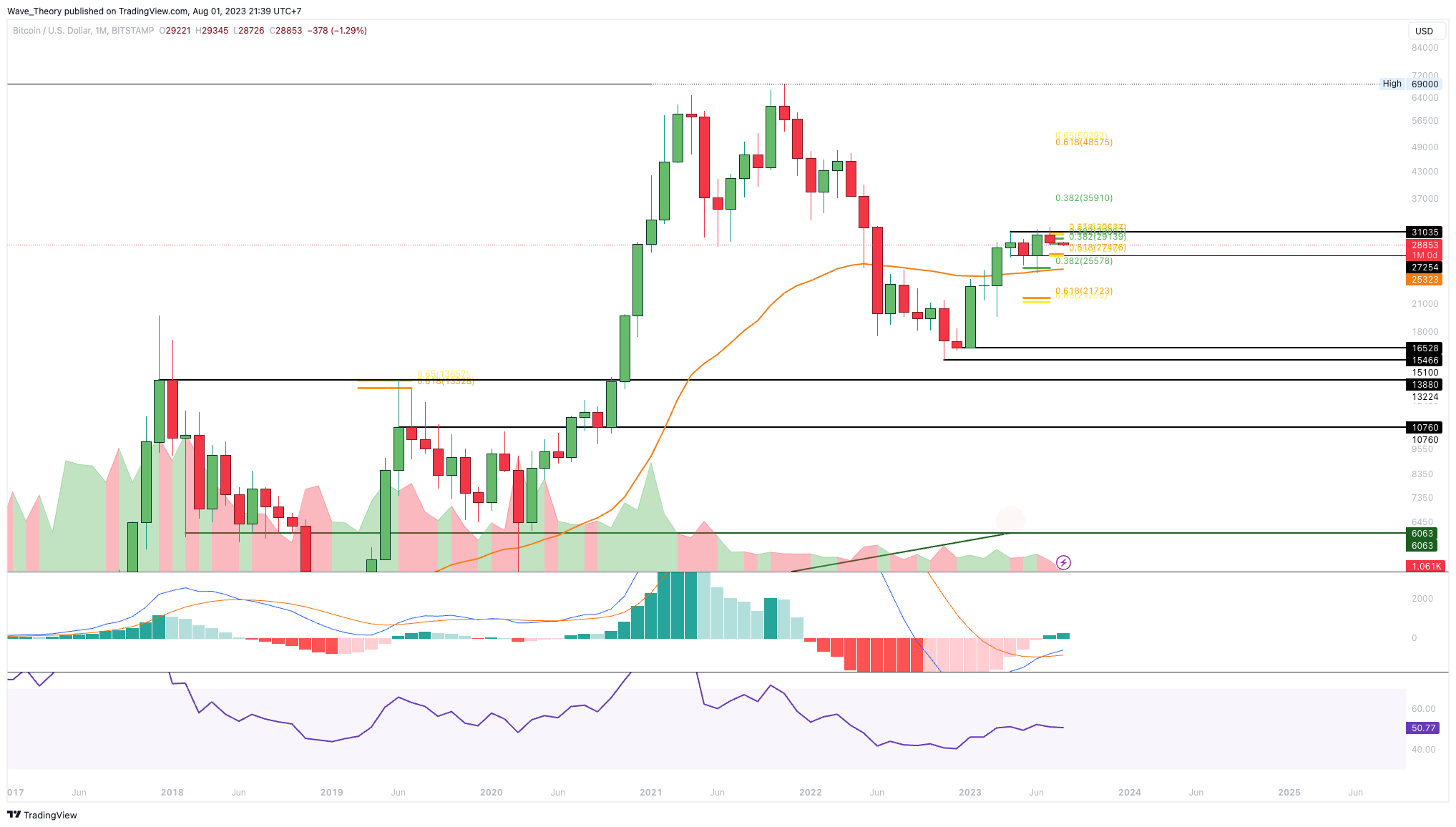 Des Weiteren wartet an der 0,382 Fib Unterstützung bei rund 25.580 USD der 50-Monate-EMA, welcher als zusätzliche Unterstützung dient. Sowohl bei rund 27.250 USD als auch bei rund 25.580 USD warten also sehr starke Unterstützungen auf den BTC Kurs.