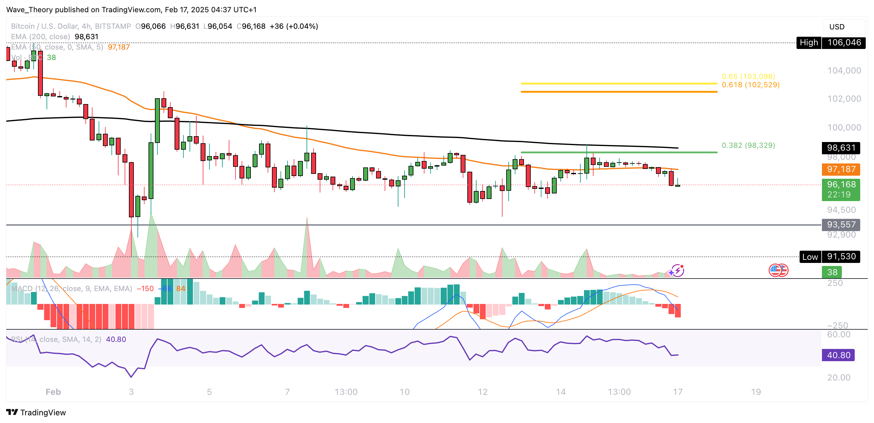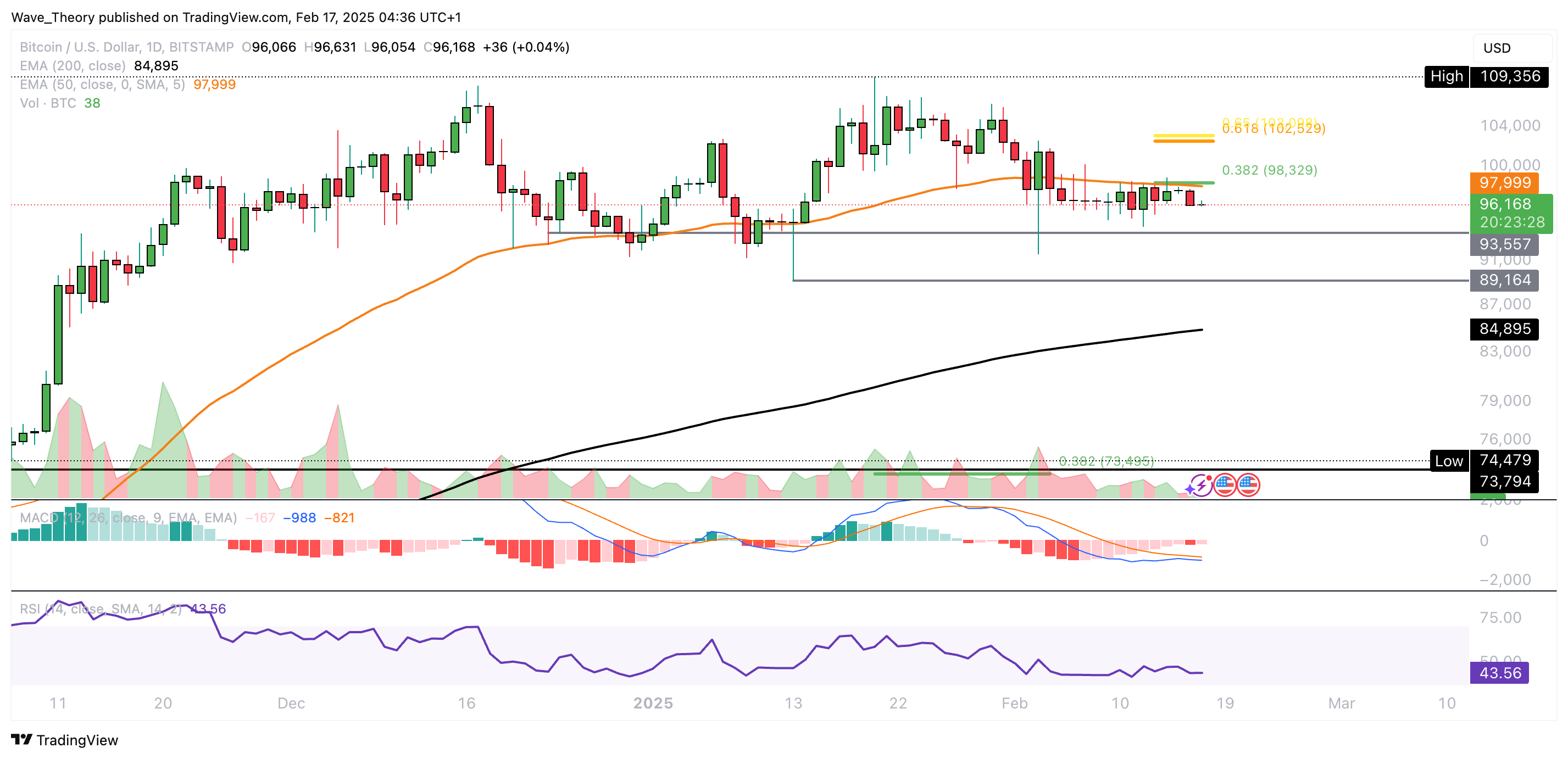 Der Bitcoin Preis scheitert seit Tagen am 50-Tage-EMA Widerstand bei rund 98.000 USD. Dort liegt zudem das 0,382 Fib Niveau, was ebenfalls als Widerstand fungiert.
