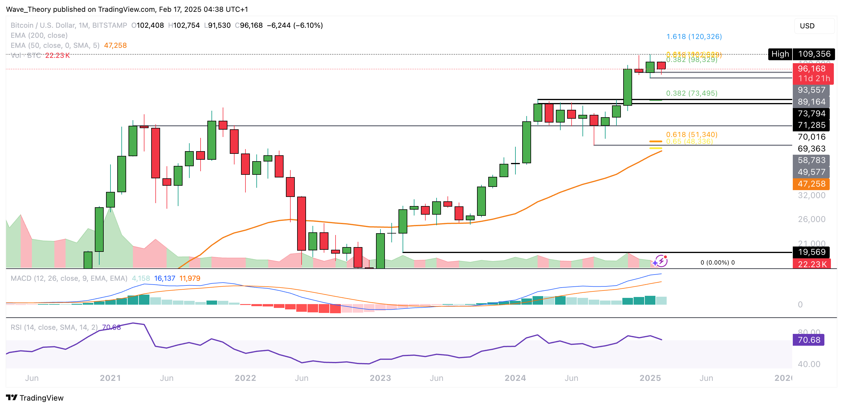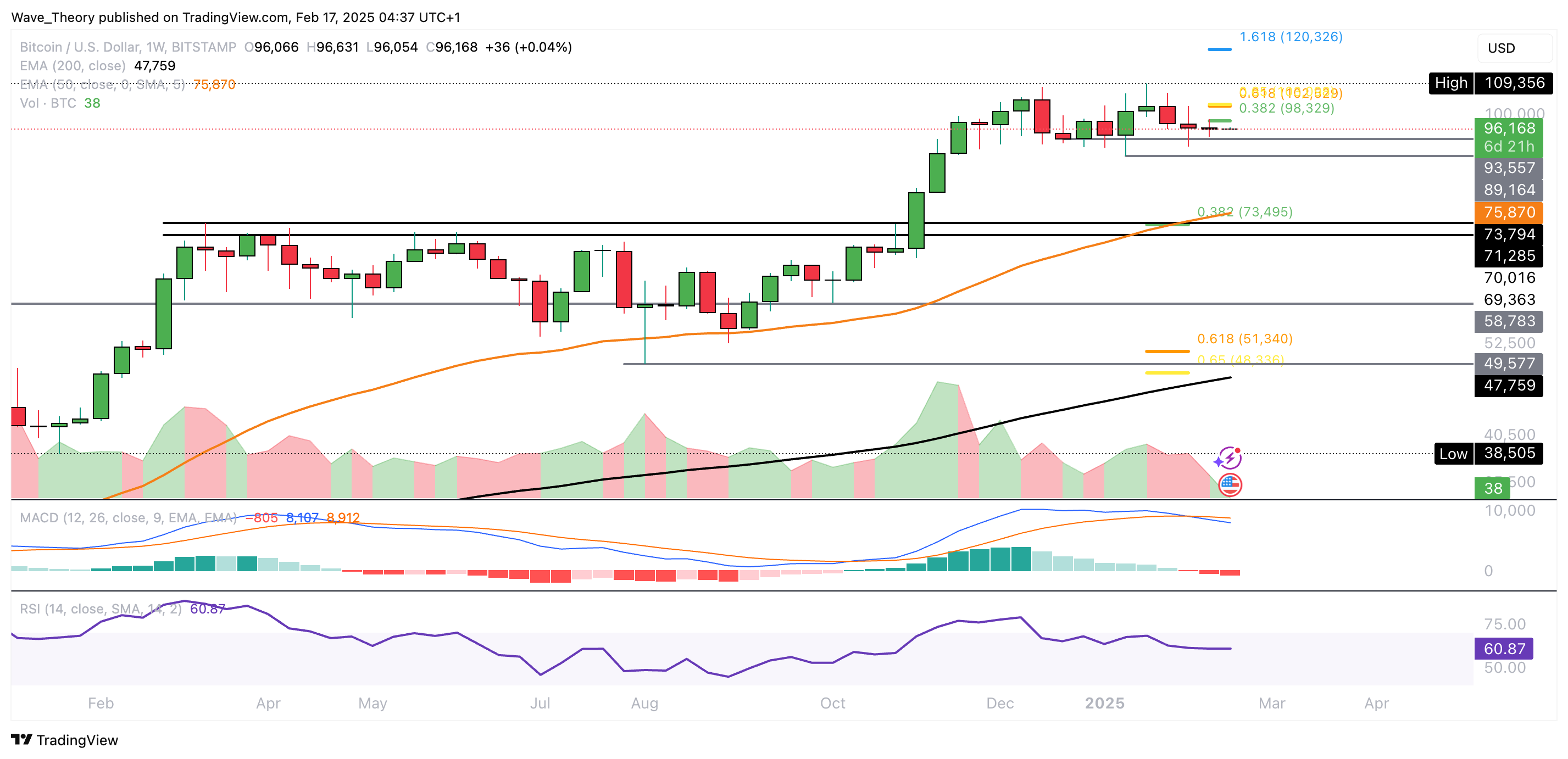 SponsoredNach unten hin wartet zwischen rund 89.160 USD und 93.560 USD signifikante Unterstützung auf den BTC Kurs. Sollte diese Unterstützung brechen, wartet am 0,382 Fib Niveau am 50-Wochen-EMA die nächste signifikante horizontale Unterstützung zwischen rund 71.285 USD und 73.800 USD.