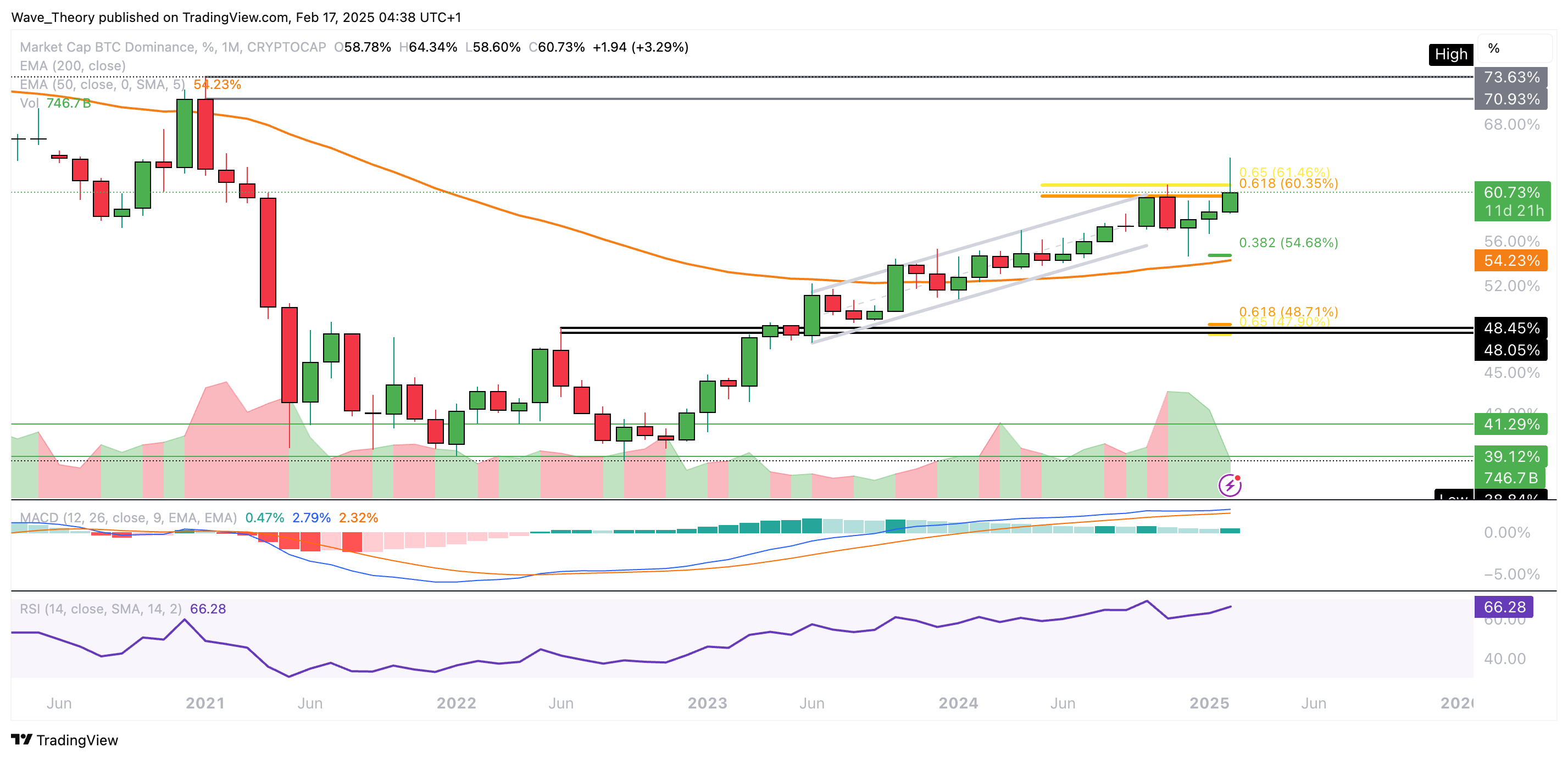 Bricht die Bitcoin Dominanz diesen Widerstand, könnte sie zum letzten Hochpunkt bei rund 72 % steigen. Wird sie hingegen bärisch abgewiesen, warten bei rund 54,7 % und 48,5 % die nächsten signifikanten Fibonacci Unterstützungen.