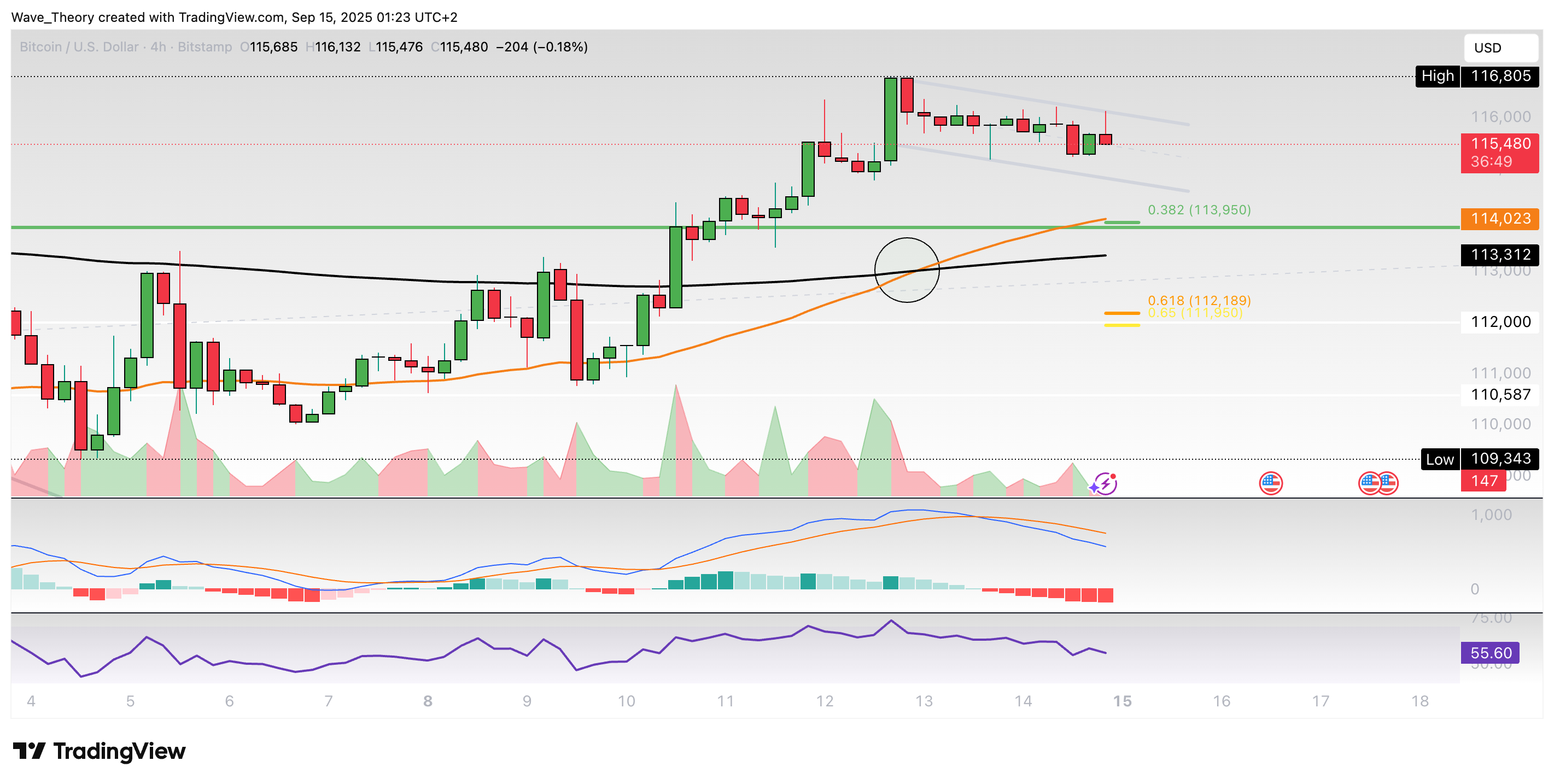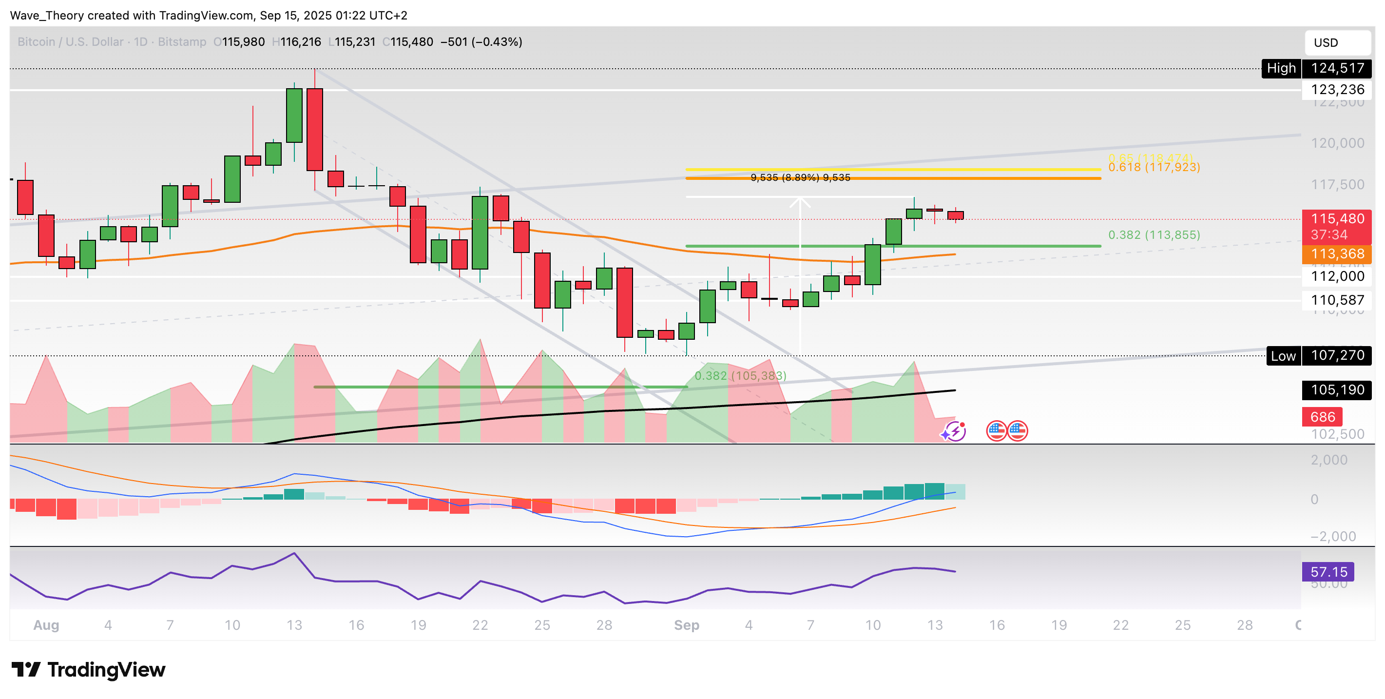 Dabei konnte Bitcoin bereits den 50-Tage-EMA und den 0,382 Fib Widerstand bei rund 113.855 USD brechen. Doch den Golden Ratio Widerstand bei rund 118.000 USD hat Bitcoin noch nicht berührt.
