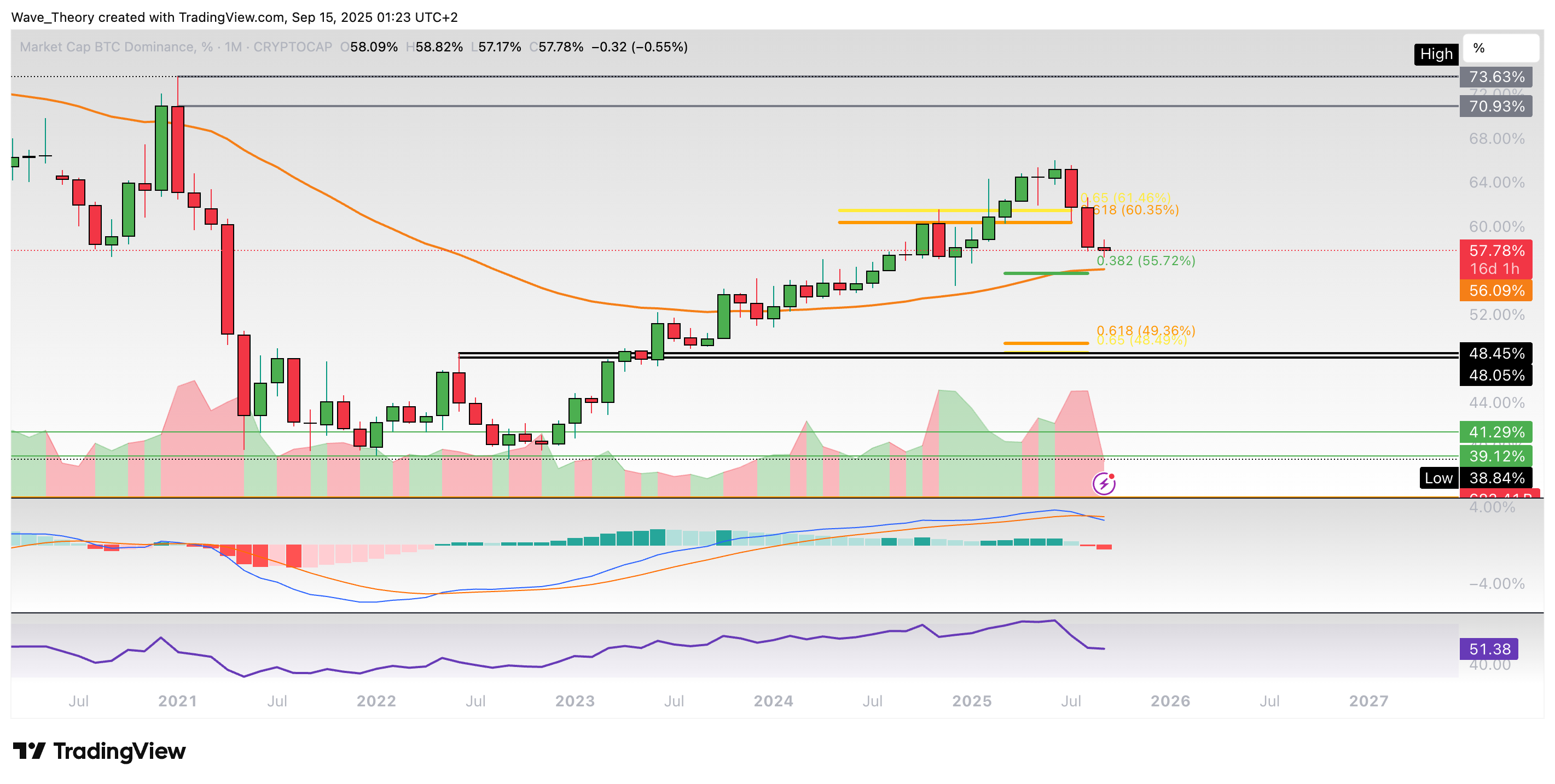 Die Bitcoin Dominanz ist nicht mehr weit entfernt von der 0,382 Fib Unterstützung am 50-Tage-EMA bei rund 56 %. Dort könnte die Dominanz bullisch abprallen.