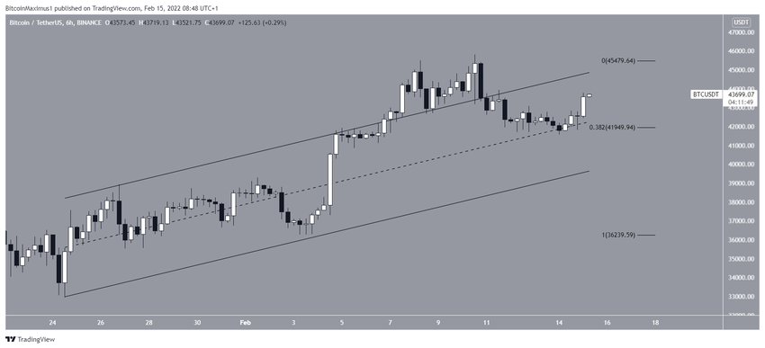 Auf dem 6-Stunden-Chart kannst du sehen, dass der Bitcoin Kurs von der Mittellinie eines aufsteigenden Parallelkanals abgeprallt ist, der seit dem 24. Januar 2022 intakt ist. Diese Linie wird kurzfristig als diagonaler Support fungieren. Dort befindet sich außerdem das 0.382-Fib-Retracement-Support-Level (41.950 USD). Bei der oberen Linie des Channels befindet sich der nächste diagonale Widerstand (ca. 45.500 USD).