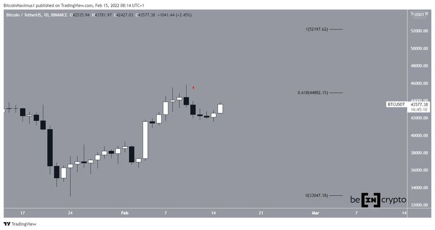 Der Bitcoin Kurs erreichte am 10. Februar 2022 den letzten Hochpunkt bei 44.821 USD. Danach ist der BTC Preis schnell wieder gefallen. Deshalb hat die entsprechende Tageskerze die Gestalt einer Shooting-Star-Candlestick, das ist ein bärisches Pattern. Der Hochpunkt befindet sich in der Nähe des 0.618-Fib-Retracement-Levels, welches typischerweise eine Schranke für einen Trendwechsel ist.
