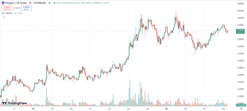 Diese Eigenschaften machen es für Entwickler und Investoren gleichermaßen attraktiv. Die Integration von Polygon in verschiedene DeFi-Projekte und die wachsende Marktakzeptanz unterstreichen seine Relevanz. Aktuell notiert MATIC bei 0,567 USD mit einem Plus von 31,24 Prozent in den letzten sieben Tagen.