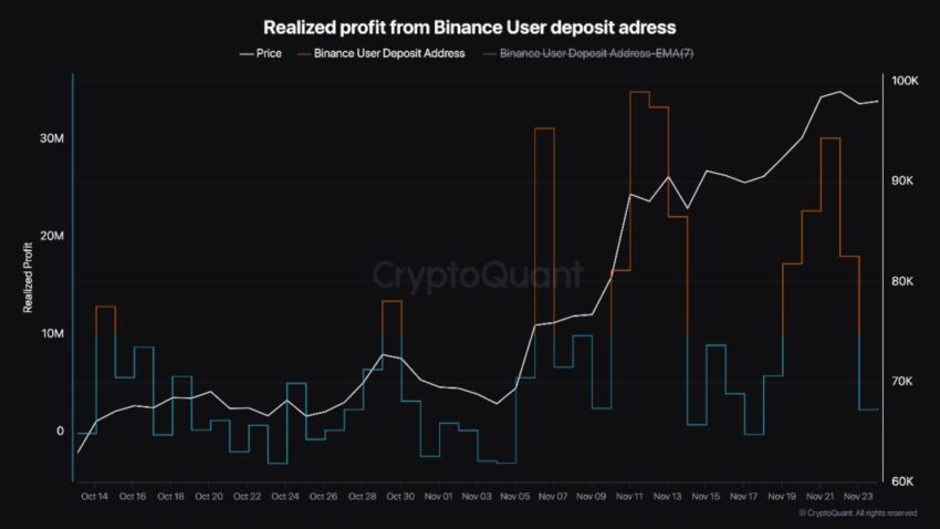 Laut dem CryptoQuant-Analysten Darkfost bieten die realisierten Gewinne von Investoren, die Bitcoin auf Binance transferieren, wertvolle Einblicke in das Marktverhalten. Binance, als eine der größten Krypto-Börse weltweit, wickelt konstant höhere Volumina ab als andere Plattformen. Nach dem Erreichen des neuen Höchststands verzeichnete die Börse einen Anstieg der realisierten Gewinne, was darauf hindeutet, dass Anleger die Preissteigerung nutzen, um Gewinne zu sichern.