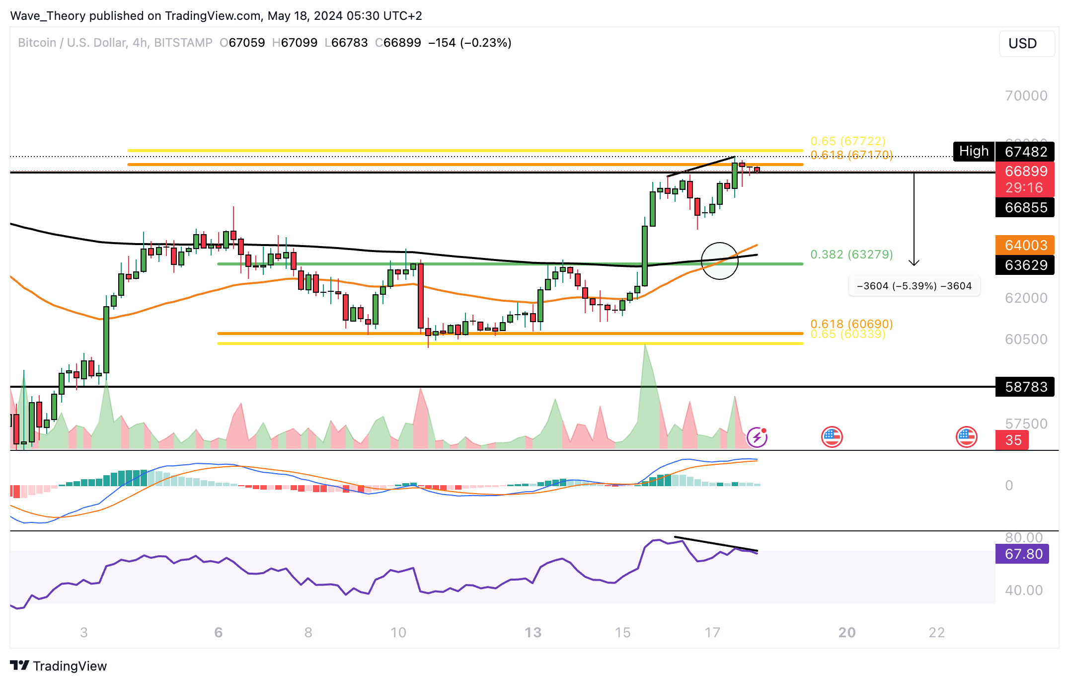 Im 4H-Chart geben die Indikatoren bärische Signale. So könnte der BTC Kurs jetzt kurzfristig am Golden Ratio Widerstand bei rund 67.500 USD bärisch abgewiesen werden.
