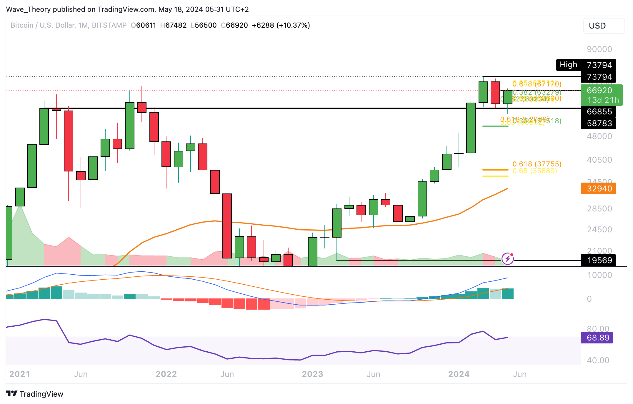 Nichtsdestoweniger könnte der BTC Kurs jetzt eine Korrektur einleiten, um das 0,382 Fib Niveau bei rund 63.280 USD zu erreichen. Das impliziert ein Abwärtspotenzial von rund 5,4 %.