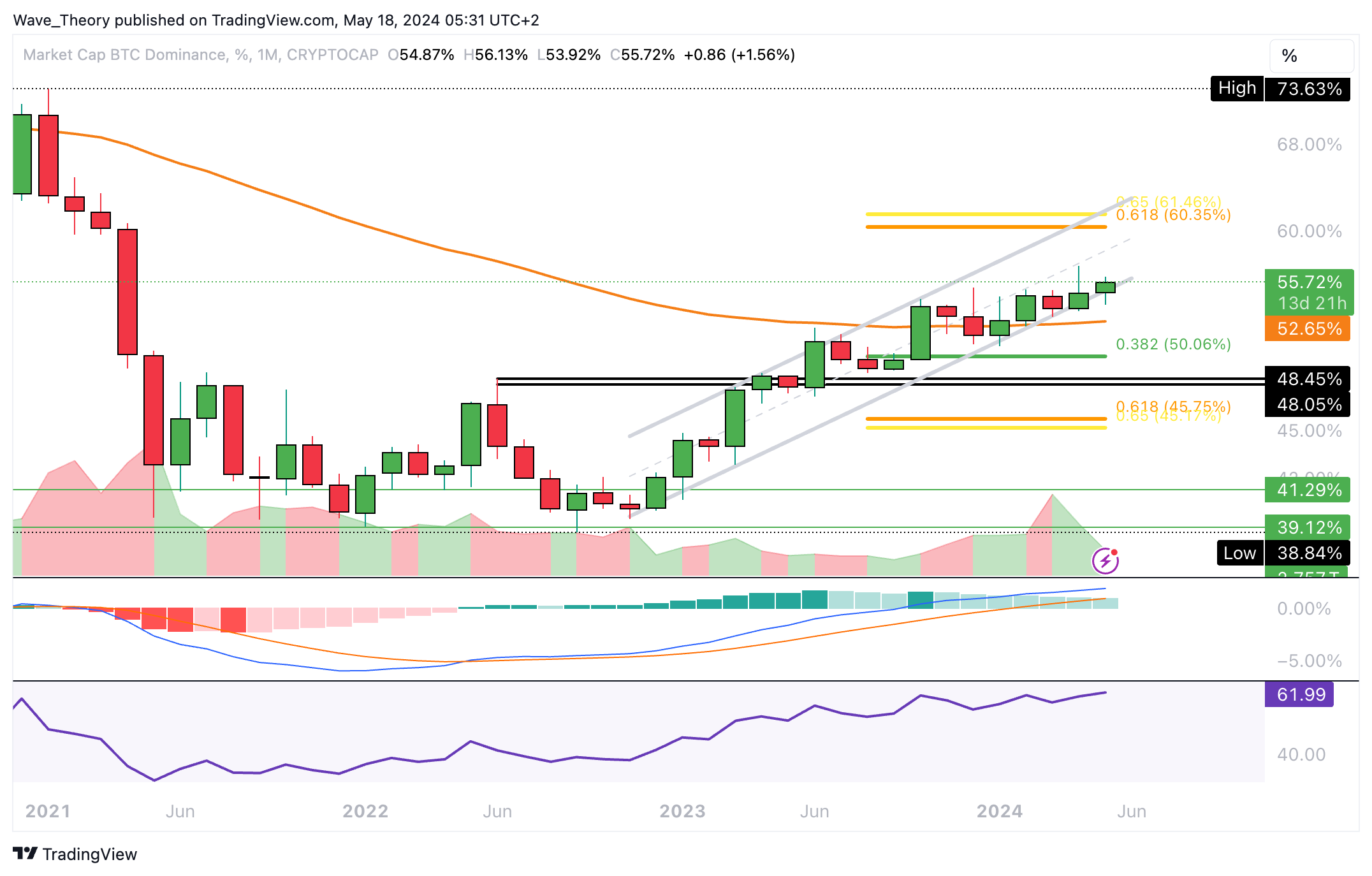 Nach unten hin findet die Bitcoin Dominanz bereits am 50-Monate-EMA bei rund 52,65 % signifikante Unterstützung. Davon abgesehen warten bei rund 50 % und 45 % die nächsten signifikanten Fib Unterstützungen.