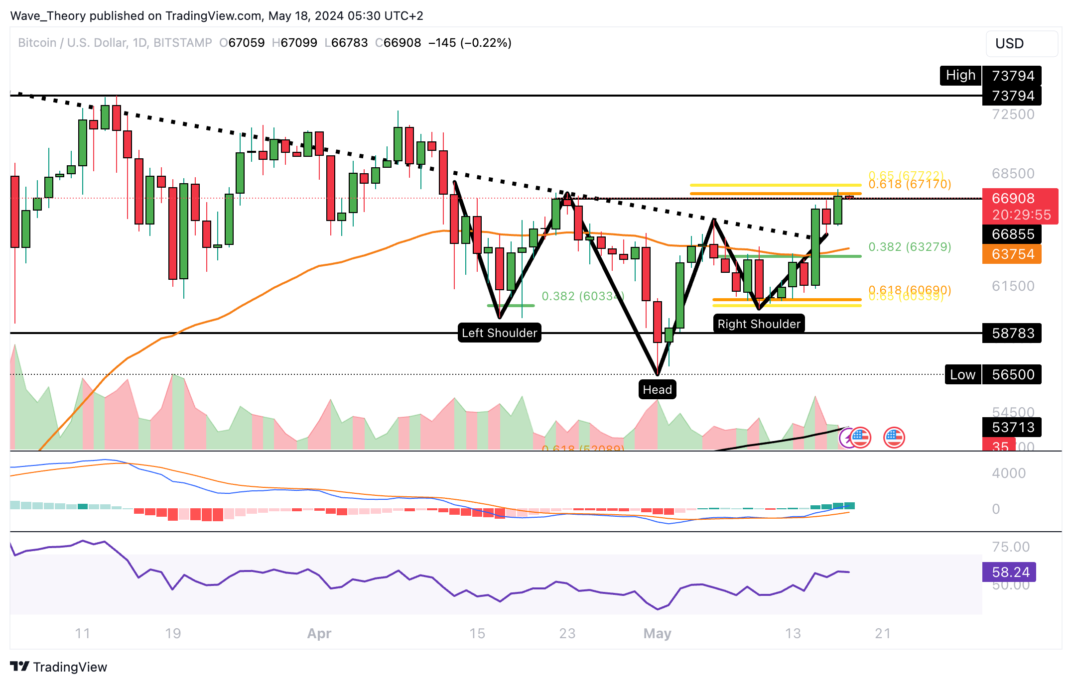 Denn Bitcoin formte ein inverses Head and Shoulders Kursmuster, woraus der BTC Kurs auch schon bullisch ausgebrochen ist. Doch damit stößt Bitcoin jetzt auf signifikanten Golden Ratio Widerstand bei rund 67.500 USD.