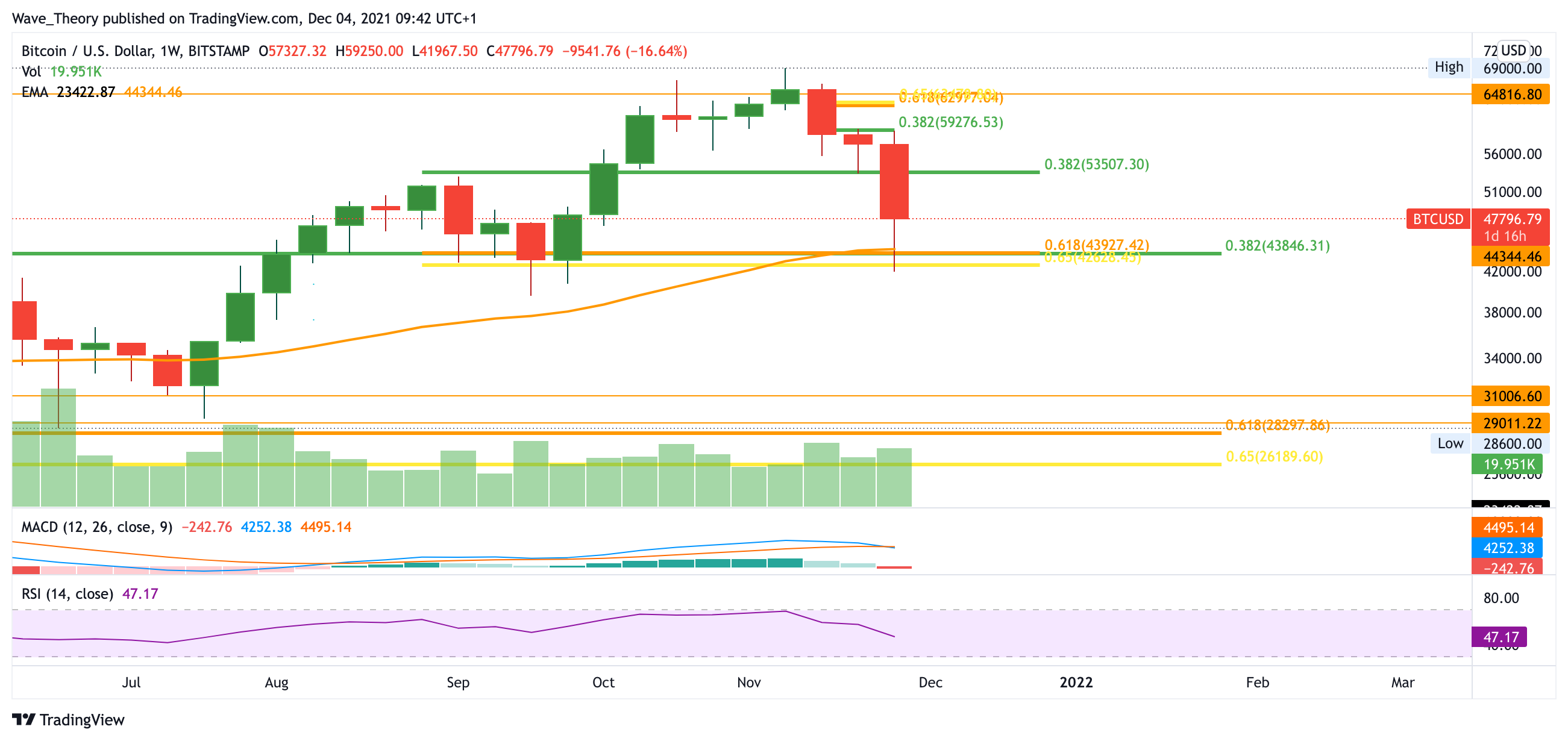 Am 9. November berichteten wir: Sofern sich der BTC Preis über 43.000 USD hält, bleibt der Trend unverändert bullisch. Bricht er jedoch darunter, könnte der BTC Kurs infolgedessen auf 30.000 USD zurückfallen, oder gar bis 20.000 USD fallen. Die Unterstützung bei 43.000 USD ist aber sehr stark und aktuell ist nicht davon auszugehen, dass der Bitcoin Kurs in absehbarer Zeit auf 20.000 USD zurückkehrt. Am 13. November 2021 hieß es: