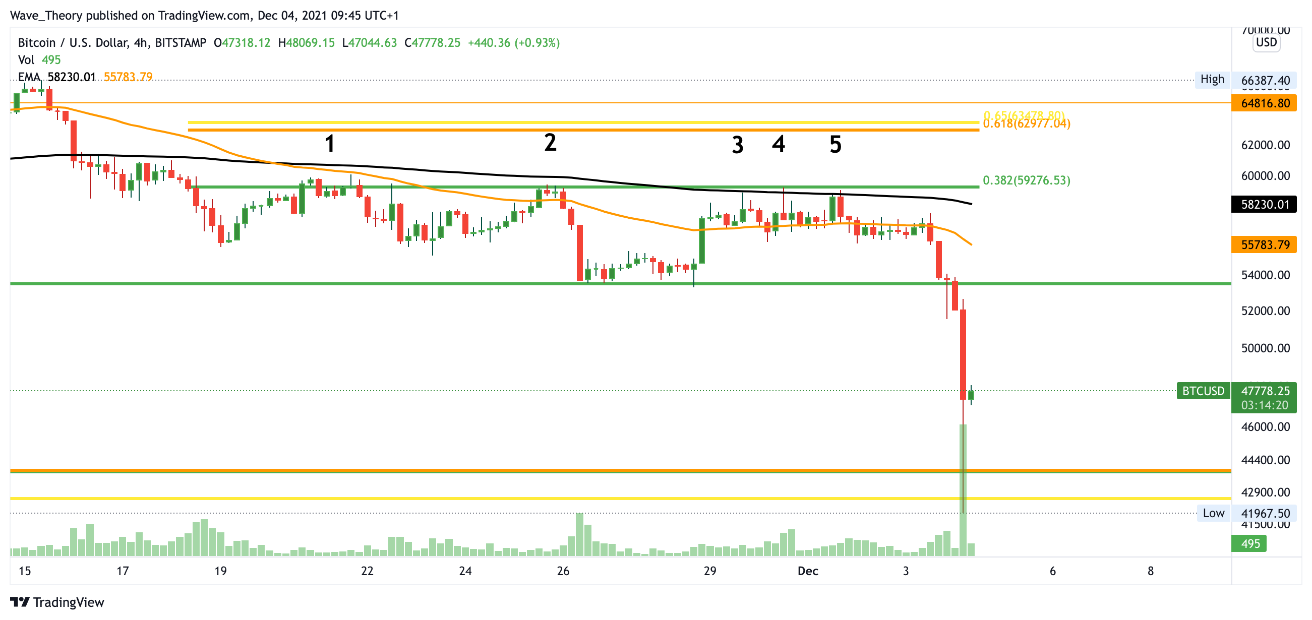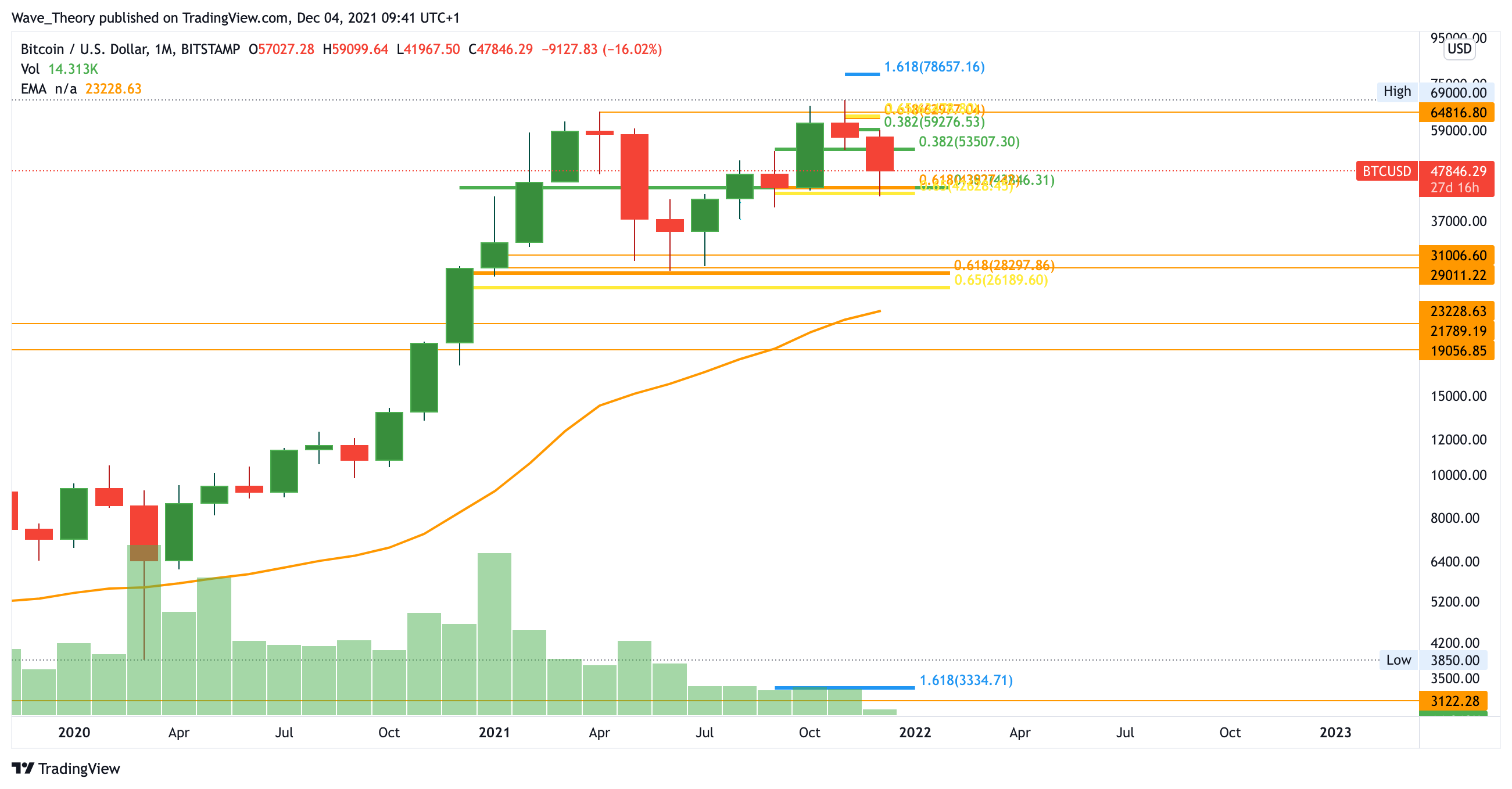 Sollte der Bitcoin Kurs jedoch unter die Golden Ratio zwischen 42.000 – 44.000 (43.000 USD) brechen, wird sich Bitcoin mit hoher Wahrscheinlich zur 30.000 USD Marke begeben, wo die letzte Golden Ratio Unterstützung auf ihn wartet. Zudem verläuft bei rund 23.000 USD der 50-Monate-EMA, welcher zusätzlich Unterstützung bietet. Gemäß der gewohnten Volatilität, ist es nicht ausgeschlossen dass Bitcoin 30.000 USD respektive 23.000 USD erreicht. Jedoch erfährt er bereits jetzt an 43.000 USD massives Kaufinteresse. Dass die 43.000 USD Unterstützung hält, ist also sehr wohl möglich. Sollte Bitcoin aber auf 30.000 USD fallen, wird er sich dort wohl nicht lange aufhalten, denn dieses Niveau wird womöglich sehr stark aufgekauft.