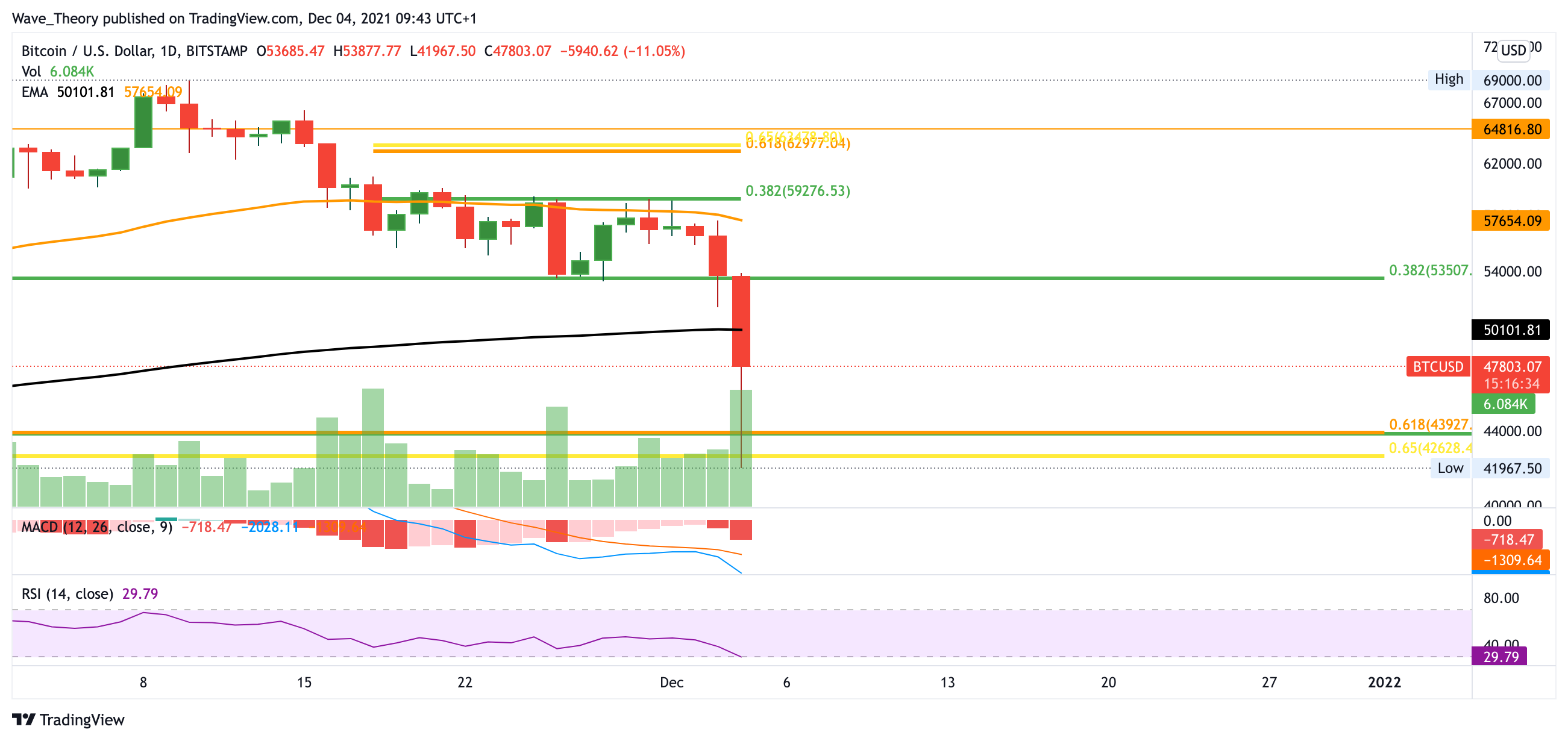 Sollte Bitcoin jedoch unter die Fib Unterstützung bei 53.500 USD fallen, findet er erst wieder bei rund 43.000 USD massive Unterstützung. An dieser Stelle hat Bitcoin exzellente Chancen stark abzuprallen. Da dort viele Unterstützungen zusammenlaufen, ist dies definitiv ein „Boden Anwärter“ für den aktuellen Korrekturzyklus von Bitcoin. – Bitcoin Kurs Prognose BeInCrypto 29. November 2021
