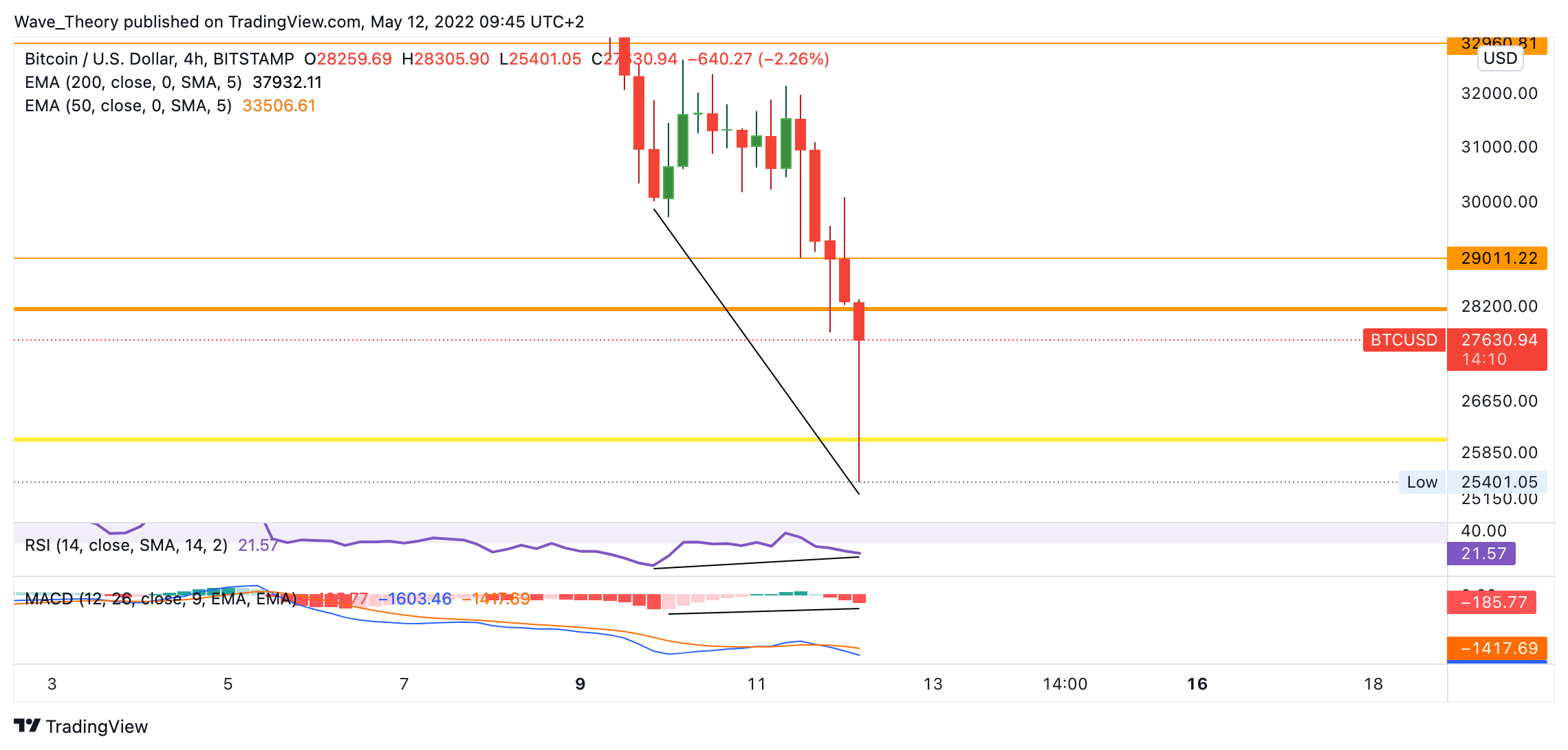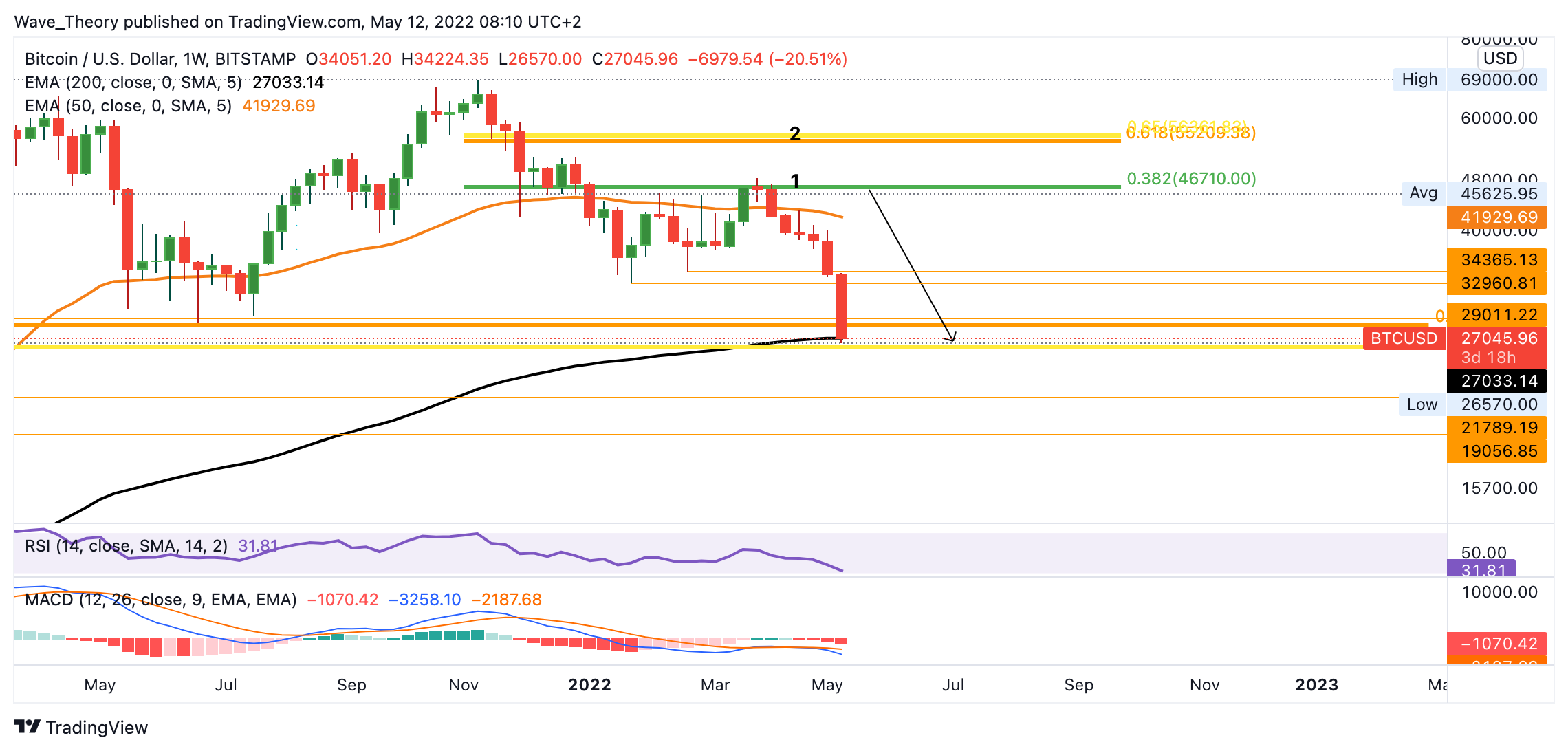 Dennoch ist Bitcoin nun an der wichtigsten Unterstützung in diesem Zyklus angekommen. Bitcoin stößt jetzt am 200-Wochen- und 50-Monate-EMA, an der Golden Ratio zwischen 26.000 – 29.000 USD auf massive Unterstützung. Jedoch gibt auch der Wochenchart keine Hinweise auf eine bullische Aufwärtsbewegung. Denn der RSI hat noch keine überverkauften Regionen erreicht und der MACD zeigt sich auch weiterhin bärisch.