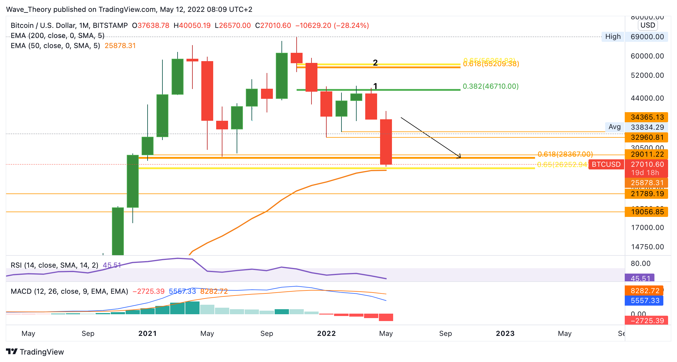 Sollte Bitcoin jetzt nicht an der Golden Ratio zwischen 26.000 – 29.000 USD abprallen, könnte er zur historischen Unterstützung zwischen 19.000 – 22.000 USD zurückkehren. Prallt Bitcoin hingegen jetzt an der Golden Ratio Unterstützung ab, könnte er rund 30-50 %, bis zu den nächsten Fibonacci Niveaus bei rund 35.000 USD und 40.000 USD steigen.