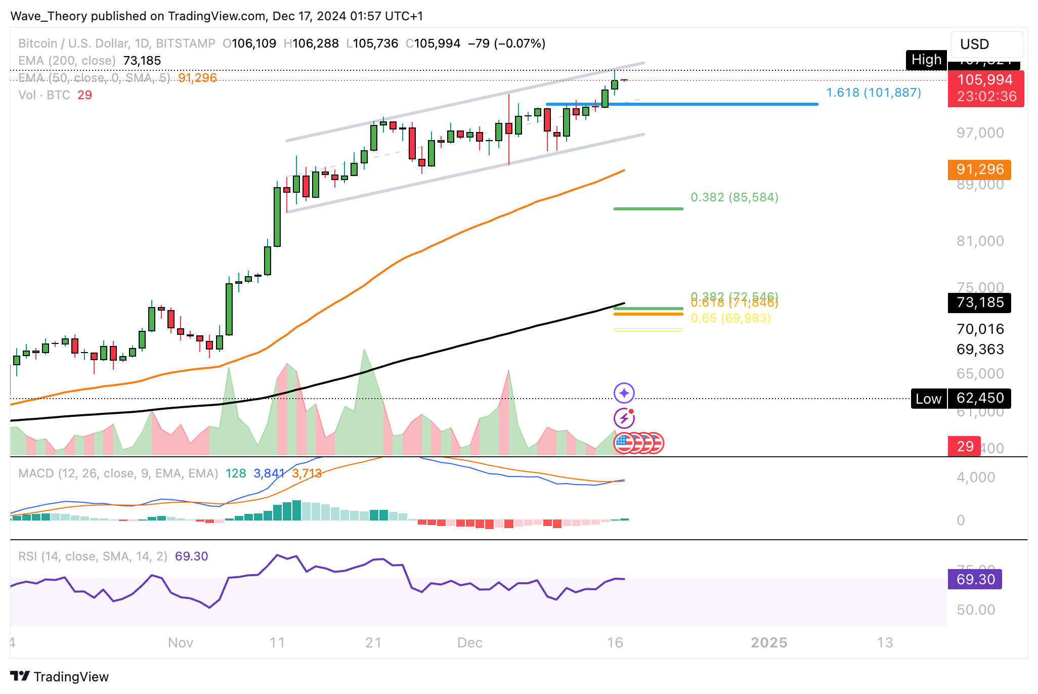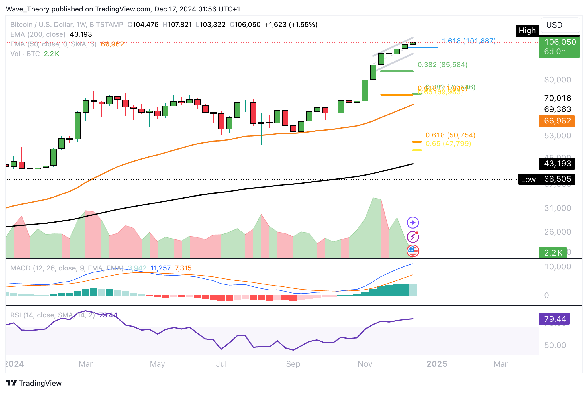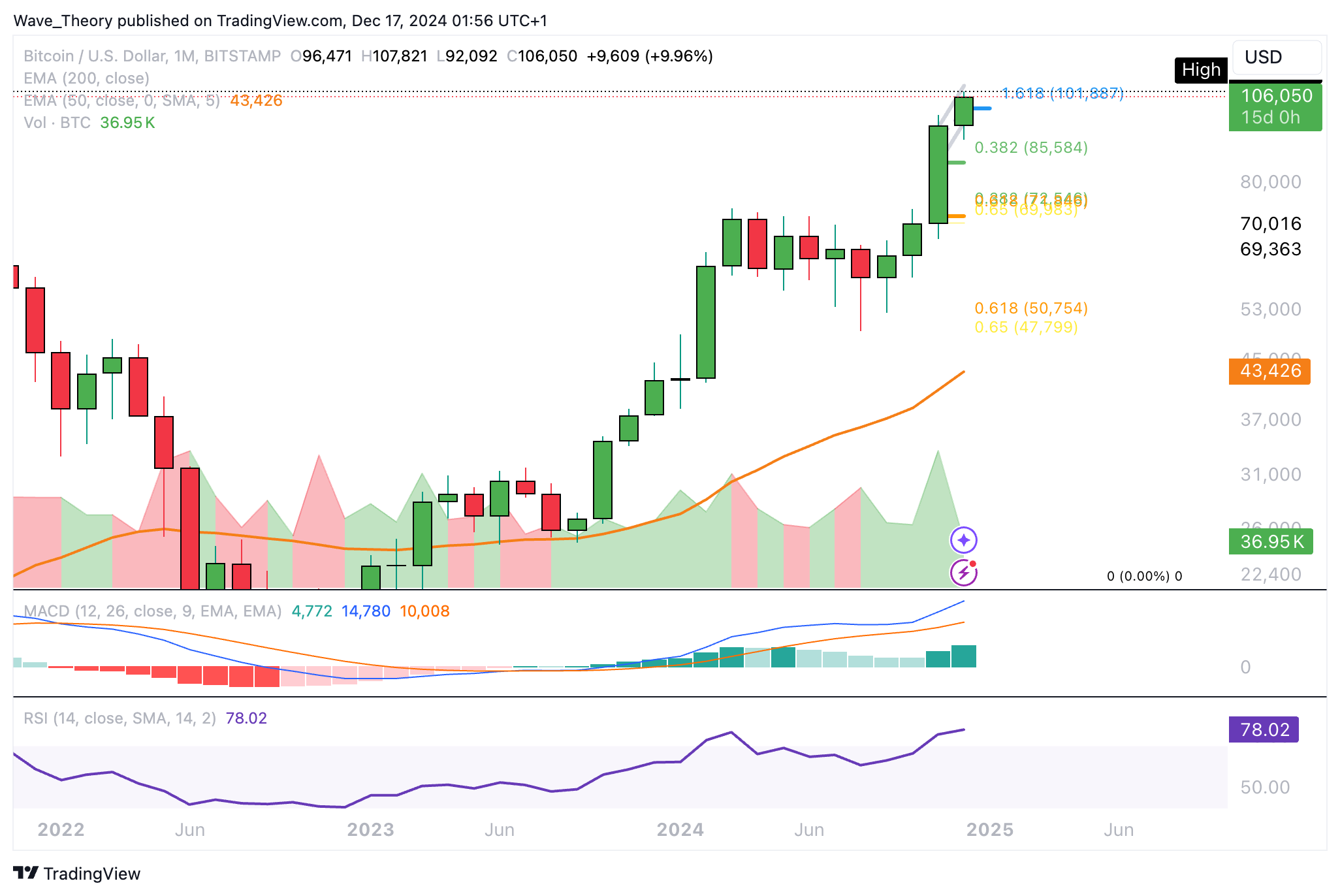 Auf den Bitcoin Preis warten keine weiteren Widerstände. So hat Bitcoin nun sogar das Fib Projektionslevel bei rund 102.000 USD überwunden, um auf rund 107.821 USD zu steigen.