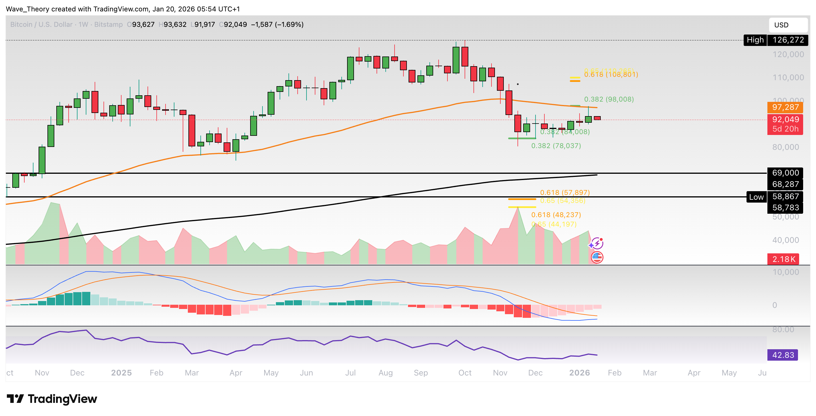 Der Bitcoin Kurs stößt jetzt am 50-Wochen-EMA am 0,382 Fib Widerstand bei rund 98.000 USD auf Widerstand