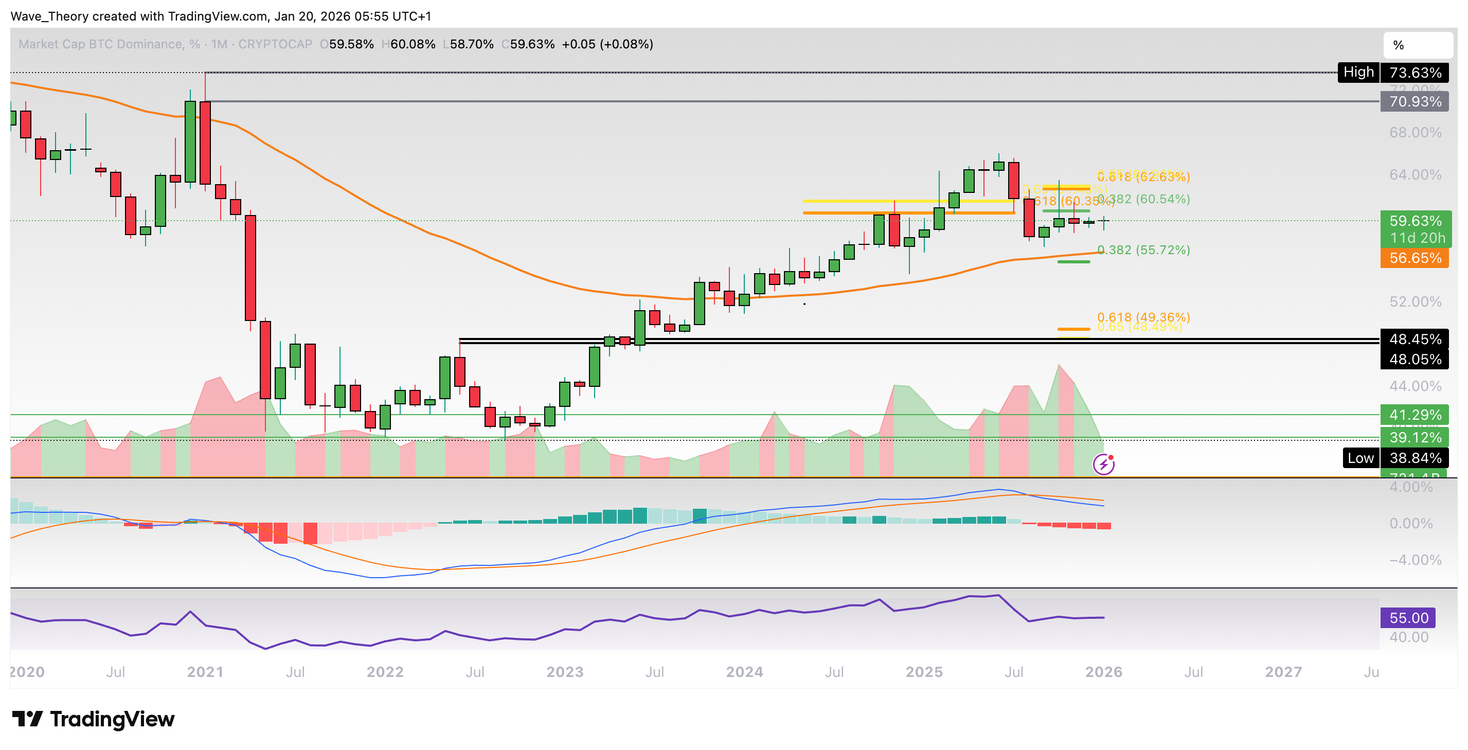 Seit mehreren Monaten hält sich die Bitcoin Dominanz unterhalb des 0,382 Fib Niveaus bei rund 60,5 %. In der Folge könnte eine Korrekturbewegung in Richtung des 50-Monate-EMAs bei etwa 56,65 % beziehungsweise zur 0,382-Fibonacci Unterstützung bei rund 55,7 % einsetzen.