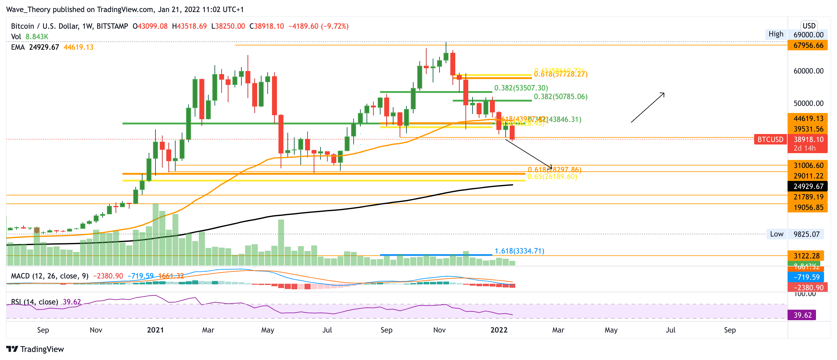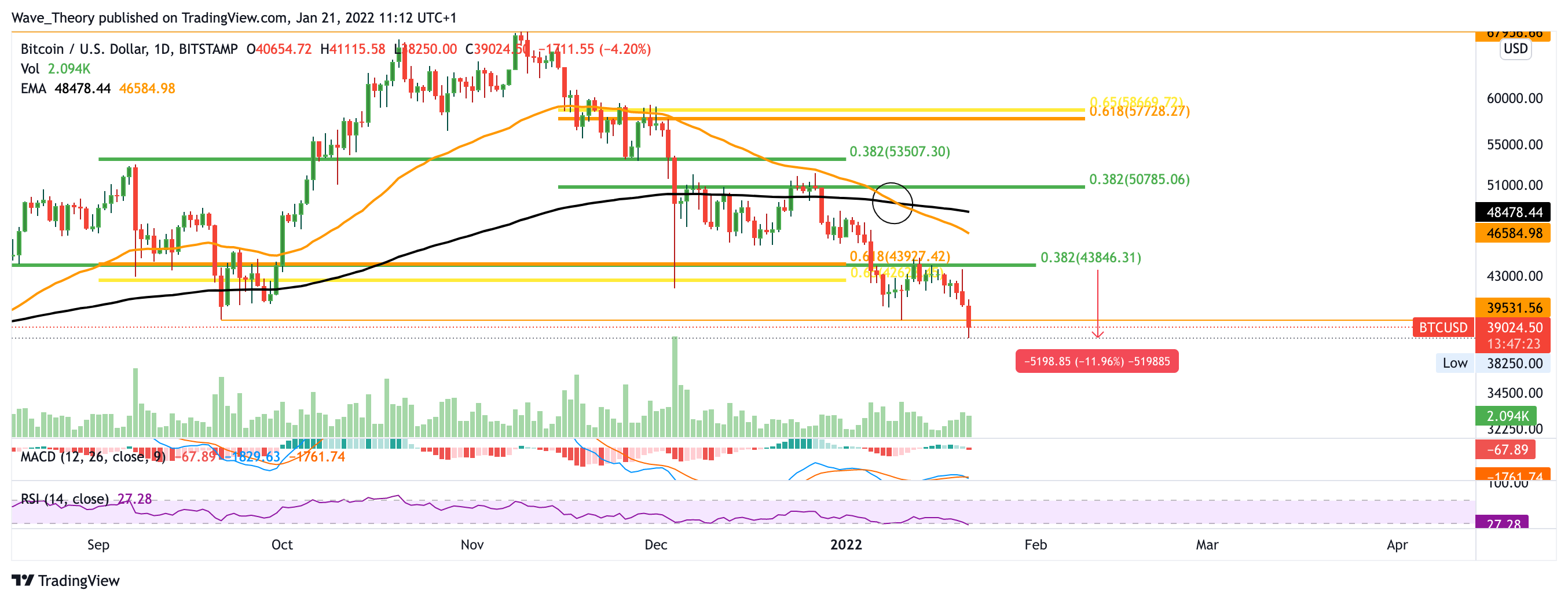 Der Bitcoin Kurs wurde am 0,382 Fib Niveau bei rund 44.000 USD abgewiesen und fiel anschließend um 12 %. Damit befindet sich der Bitcoin Kurs aktuell unter der Unterstützung bei 39.500 USD und sollte sich Bitcoin nicht ganz schnell wieder über dieses Preisniveau kämpfen, könnte es eng werden. Dann könnte Bitcoin sehr schnell auf 30.000 USD zurückkehren. Auch der MACD zeigt sich bärisch: Das Histogramm tickt bärisch tiefer während die MACD Linien bärisch überkreuzt sind. Darüber hinaus erreicht der RSI allmählich überverkaufte Regionen.