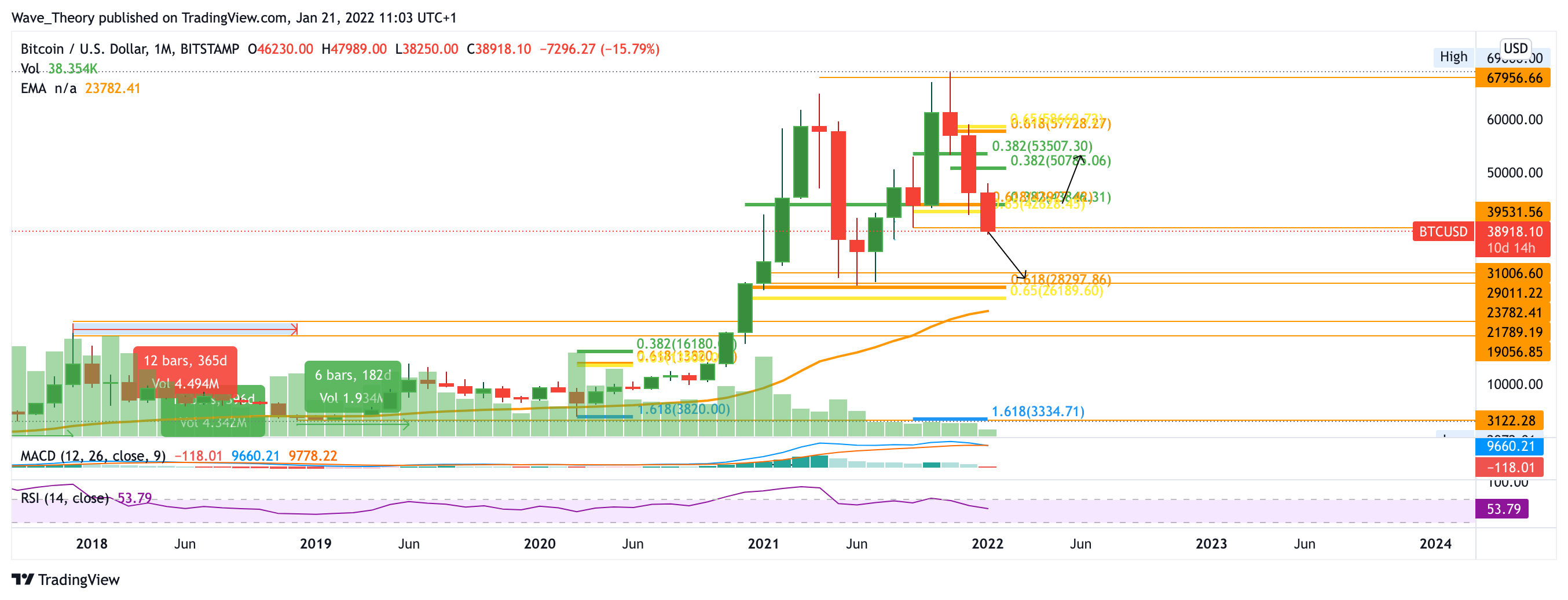 Sollte sich der Bitcoin Preis jedoch doch über der Unterstützung bei 39.500 USD halten, könnte er erneut zum Widerstand bei rund 44.000 USD steigen. Um wieder bullisch zu werden, muss Bitcoin zumindest rund 51.000 USD respektive 58.000 USD brechen. Dort liegen die Schlüsselwiderstände an den Fibonacci Niveaus. Aber auch im Monatskurs signalisiert der MACD eine Fortsetzung der Abwärtsbewegung: die MACD Linien sind bärisch überkreuzt und das Histogramm tickt bärisch nach unten.