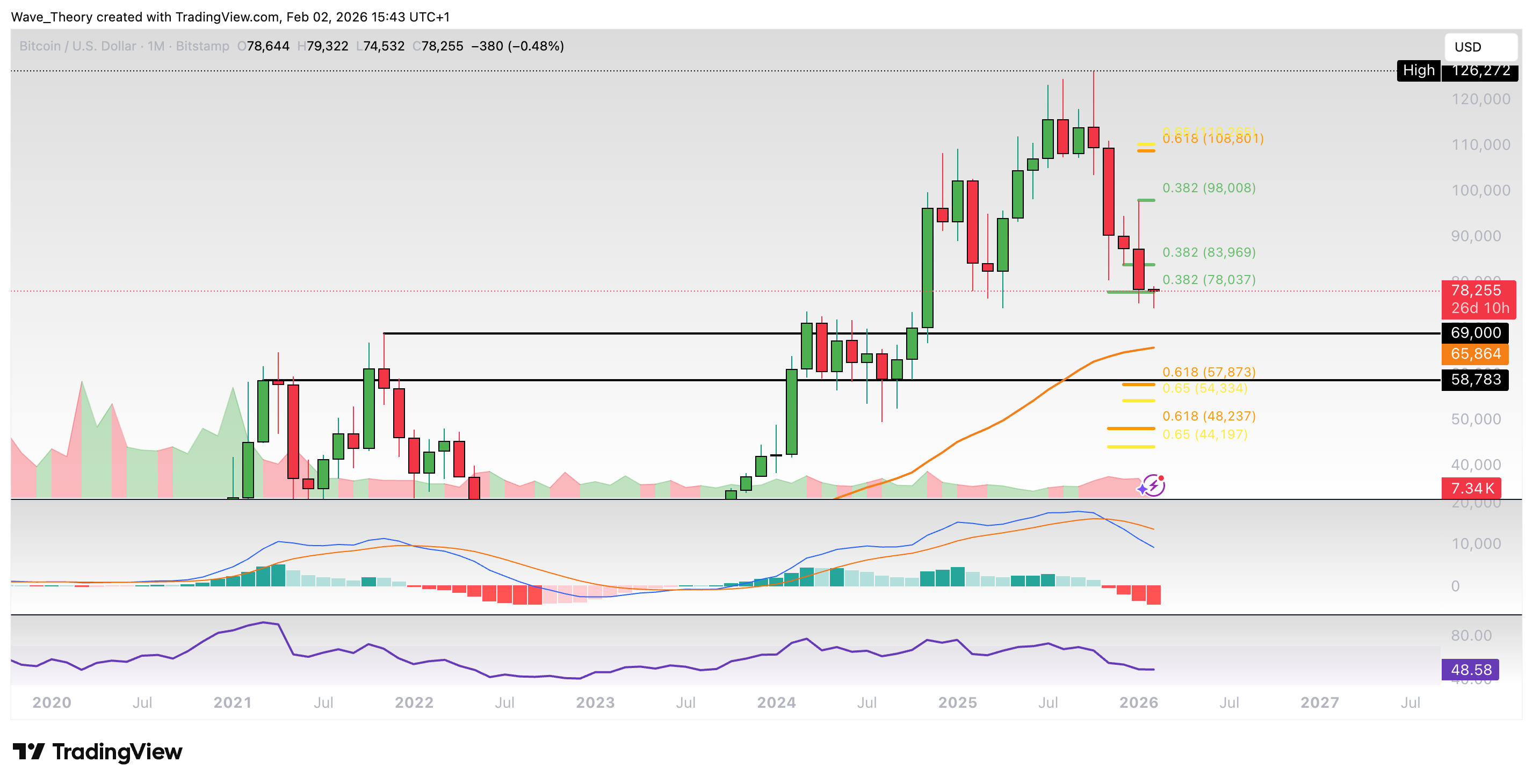 Der BTC Kurs wurde letzten Monat am 0,382 Fib Niveau bei rund 98.000 USD bärisch abgewiesen. Anschließend ist er zur 0,382 Fib Unterstützung bei rund 78.000 USD korrigiert.