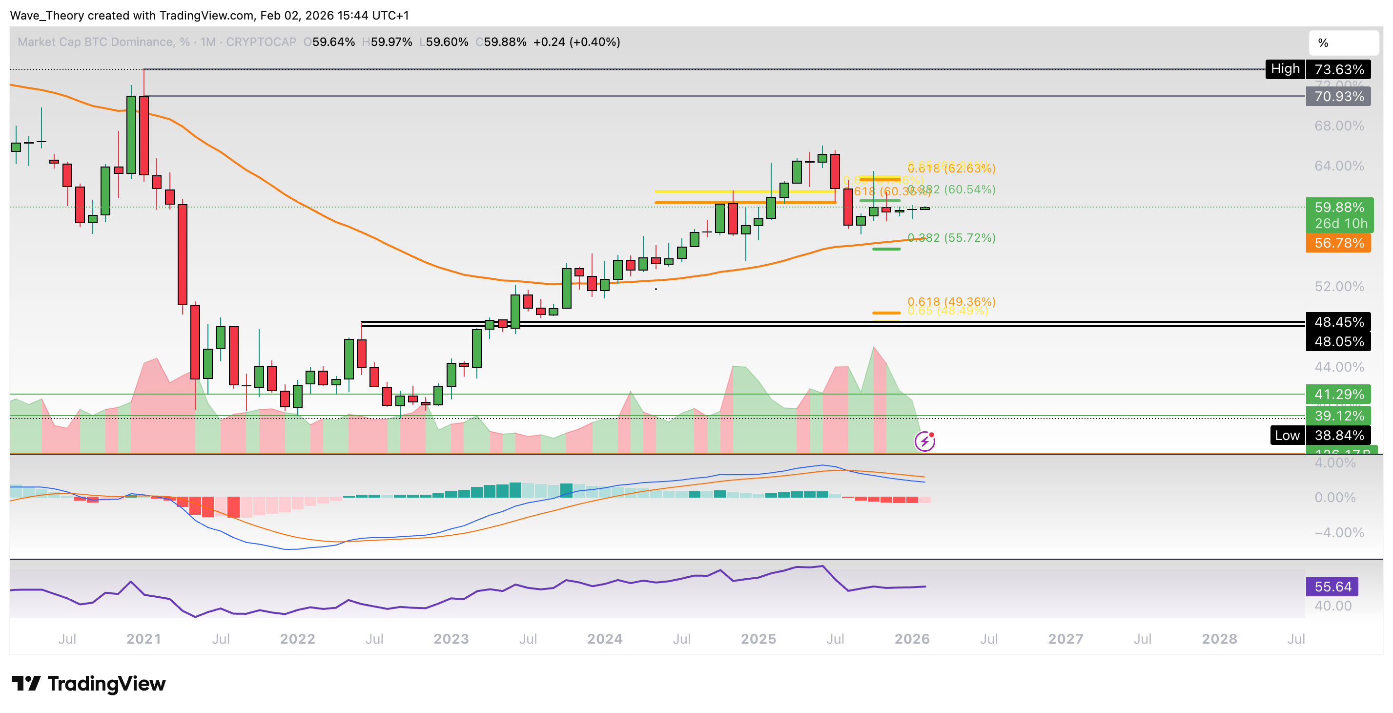 Die Bitcoin Dominanz hält sich seit vielen Monaten unterhalb des 0,382 Fib Niveaus bei rund 60,5 %. In der Folge könnte eine Korrektur in Richtung des 50-Monate-EMA bei etwa 56,8 % oder zur 0,382 Fibonacci Unterstützung bei rund 55,7 % kommen.