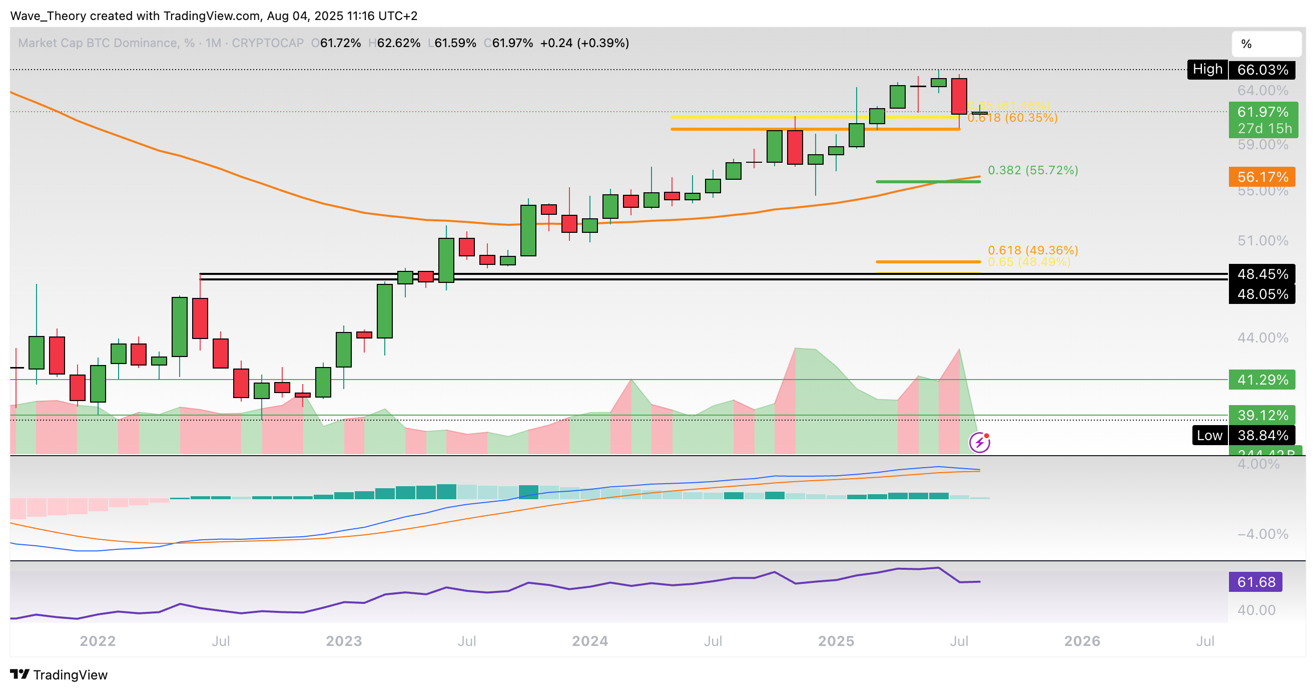 Die Bitcoin Dominanz scheint jetzt an der Golden Ratio Unterstützung bei rund 60,5 % bullisch abzuprallen. Sollte sie jedoch bärisch brechen, warten bei rund 55,7 % und bei rund 49 % die nächsten signifikanten Fib Unterstützungen.