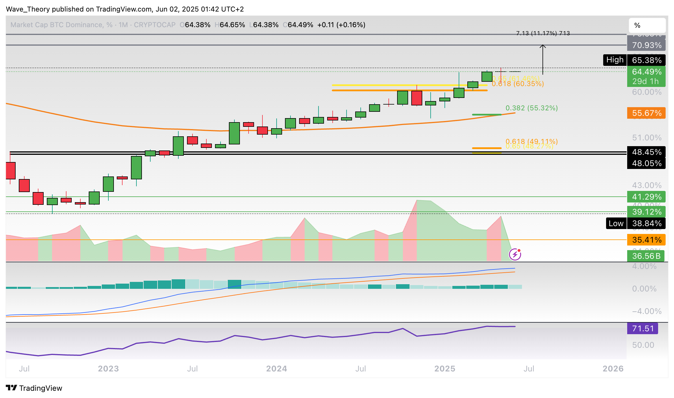 Nach unten hin findet die BTC Dominanz nach wie vor an der Golden Ratio bei rund 60,5 % Unterstützung.