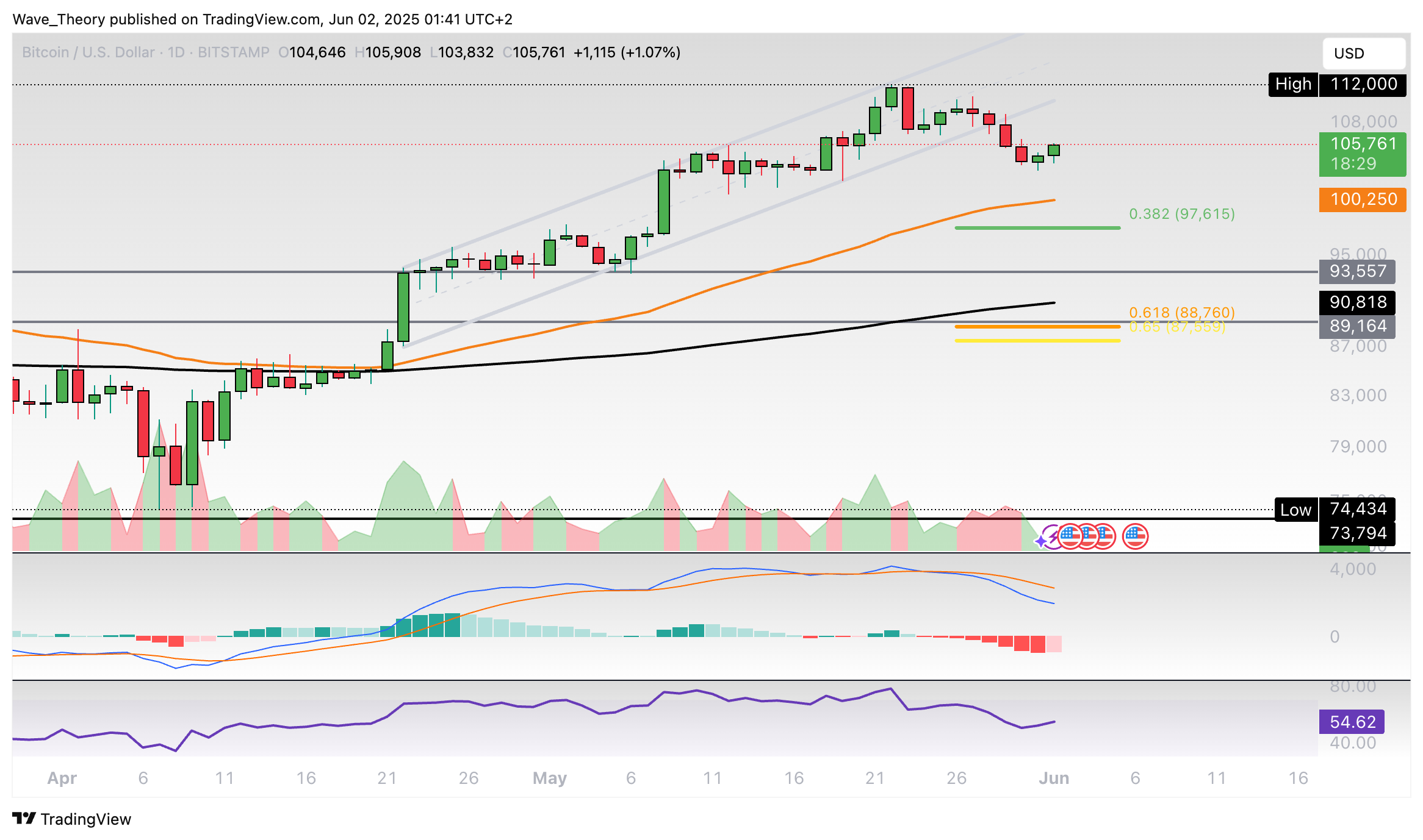Darüber hinaus weist das Histogramm des MACDs einen Aufwärtstrend auf, während sich der RSI in neutralem Gebiet bewegt. Sollte der Kurs noch höher steigen, warten bei rund 106.524 USD und bei rund 109.000 USD die nächsten signifikanten Fibonacci Widerstände.