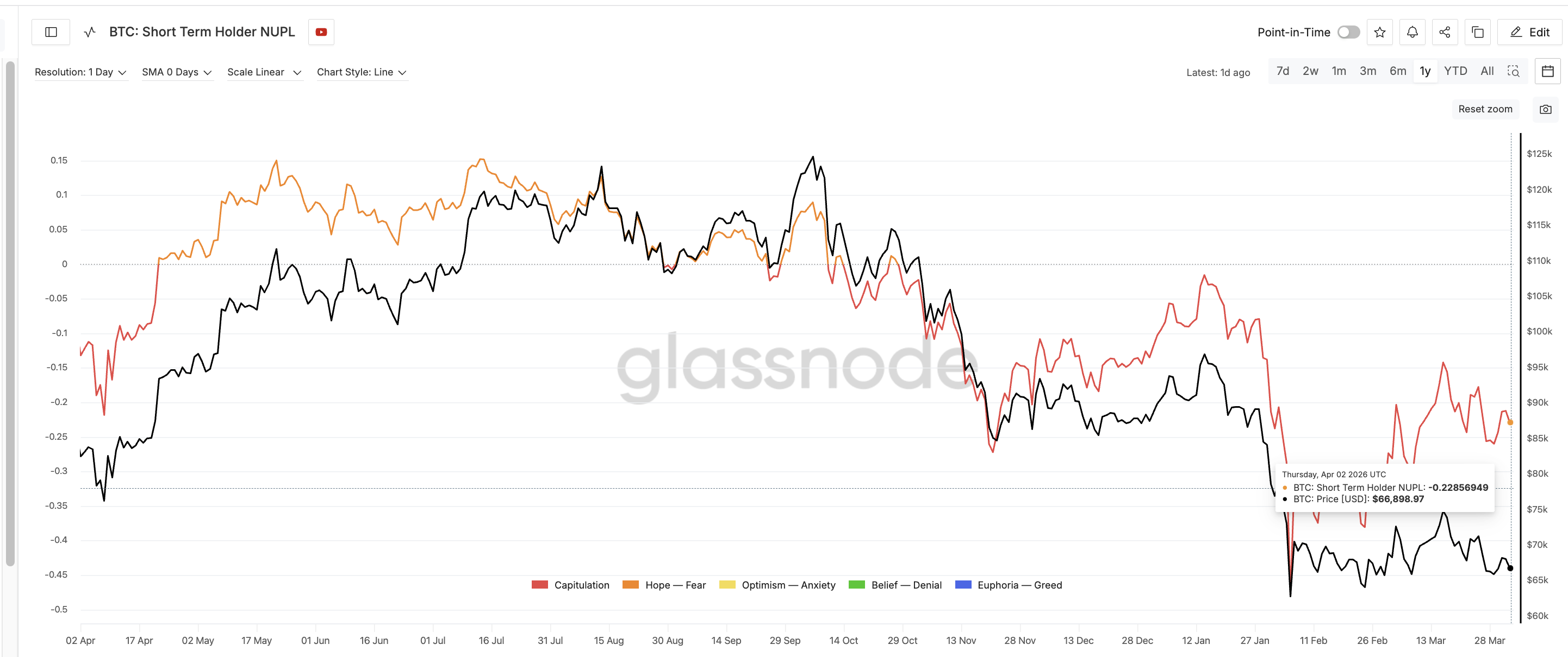 Der Short-Term Holder Net Unrealized Profit/Loss (STH-NUPL), ein von Glassnode entwickelter Indikator, misst, ob kürzlich eingestiegene Käufer insgesamt im Gewinn oder Verlust sind. Der aktuelle Wert liegt bei -0,22. Damit befinden sich Kurzzeitteilnehmer in der Kapitulationszone, das heißt die jüngsten Käufer haben im Durchschnitt einen nicht realisierten Verlust von 22 %.