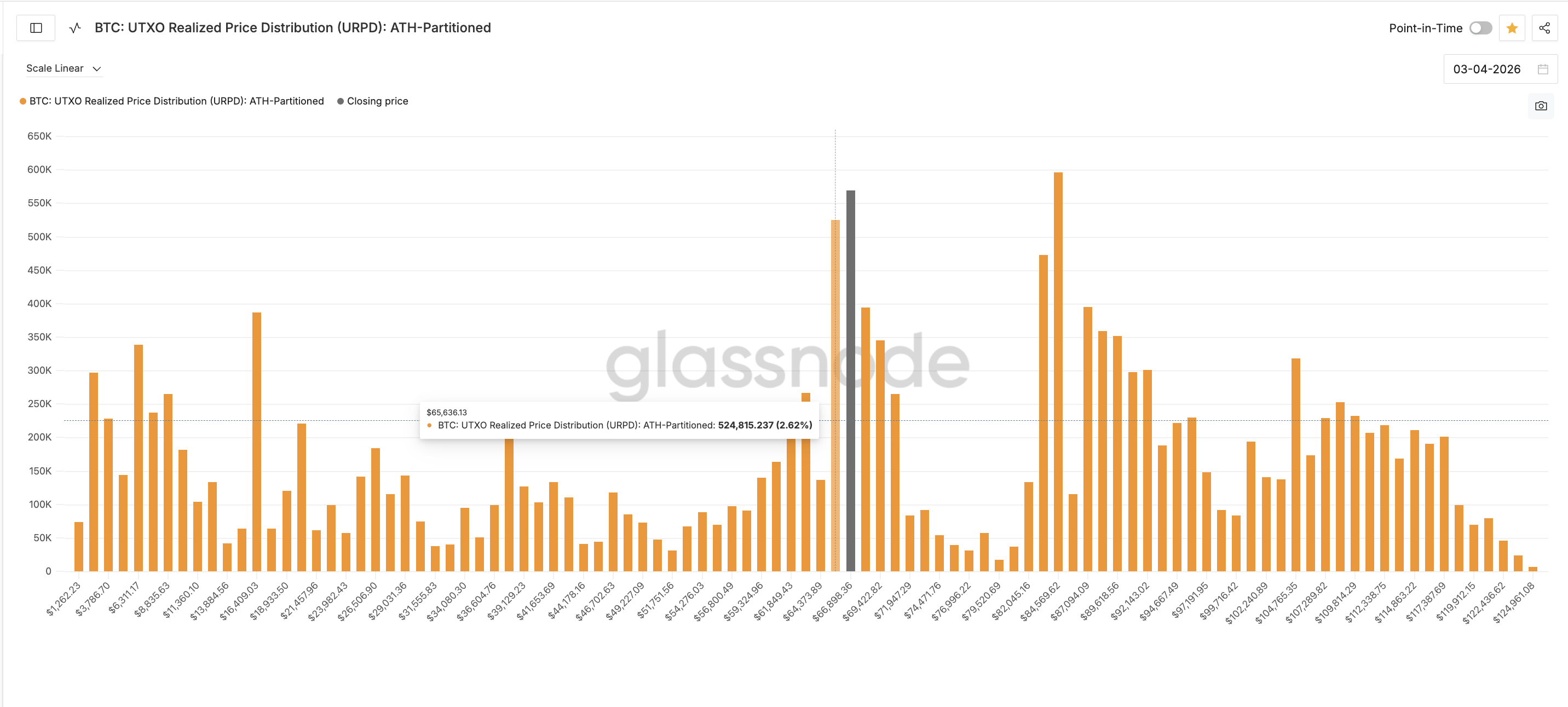 Die UTXO Realized Price Distribution (URPD), ein weiteres Analysewerkzeug von Glassnode, verdeutlicht, wo sich wichtige Angebotscluster befinden. Das größte kurzfristige Angebotscluster findet sich bei 65.636 USD, wobei dort rund 524.815 BTC, was 2,62 % des gesamten Umlaufangebots entspricht, zuletzt den Halter gewechselt haben. Ein zweites Cluster liegt bei 64.373 USD mit 0,68 % Angebot.