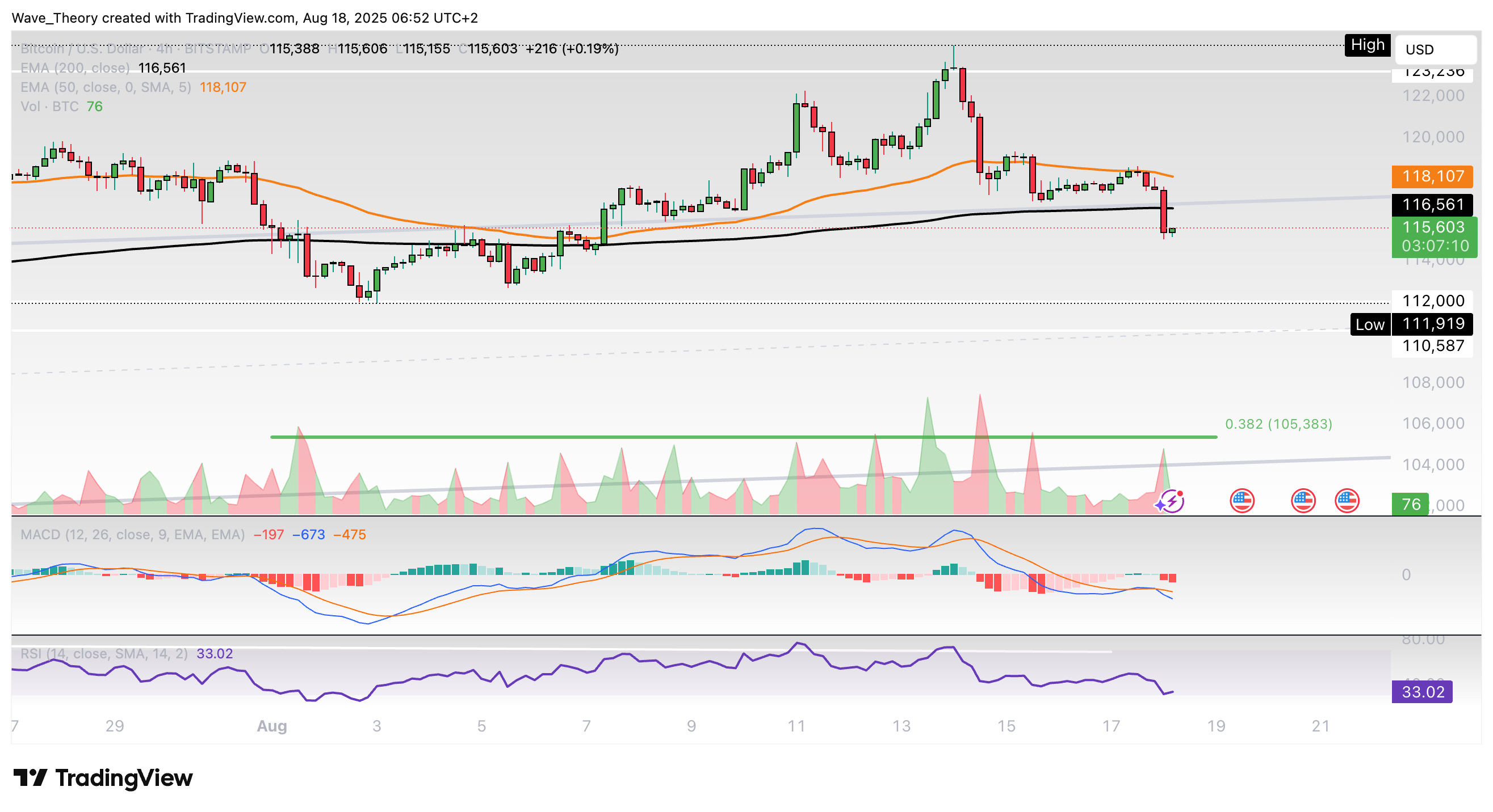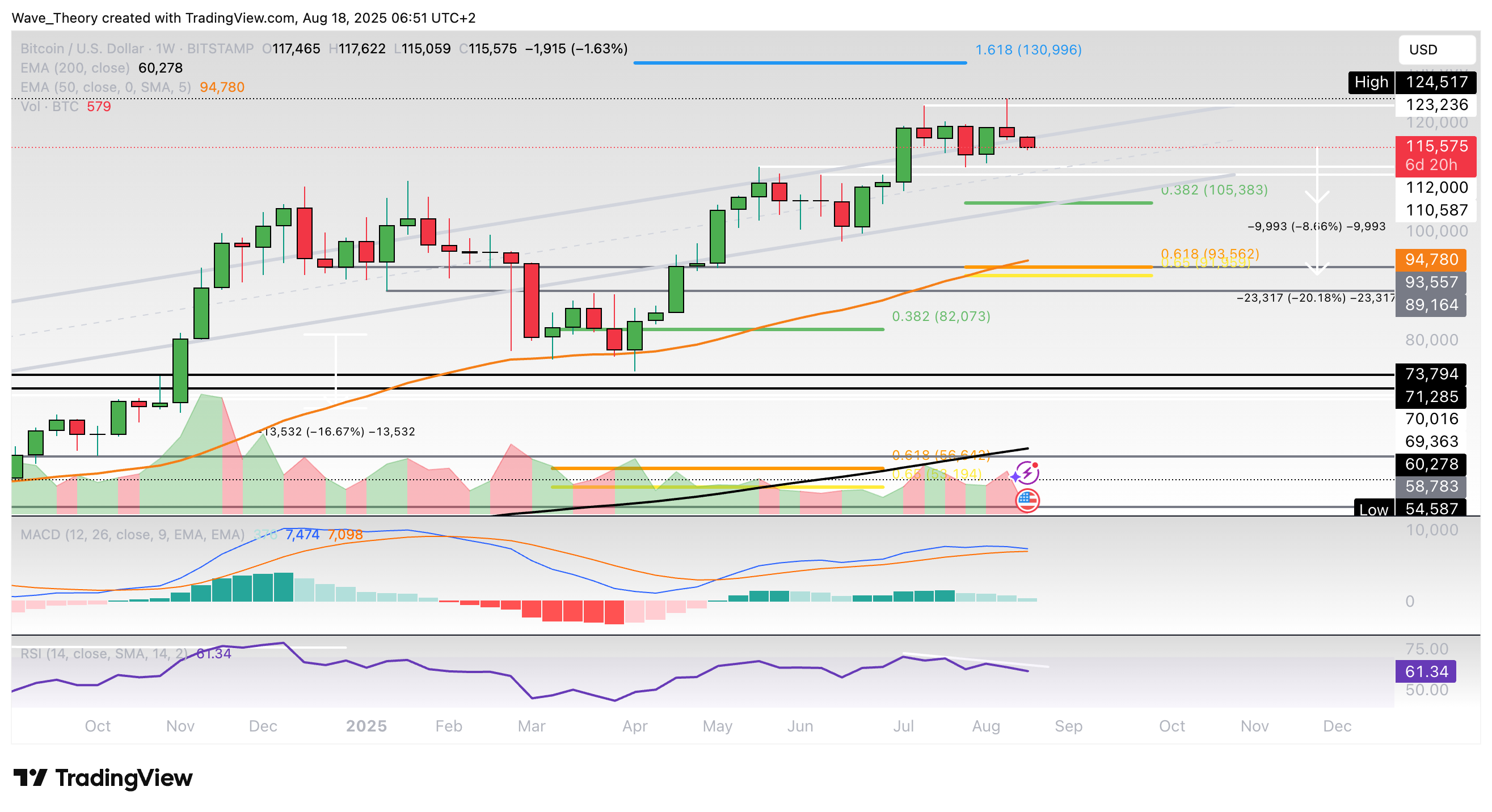 Bitcoin hat jetzt rund 9 % bis 20 % Abwärtspotenzial, bis er auf die nächsten signifikanten Fibonacci Unterstützungen trifft. Damit könnte BTC auf rund 105.400 USD korrigieren.