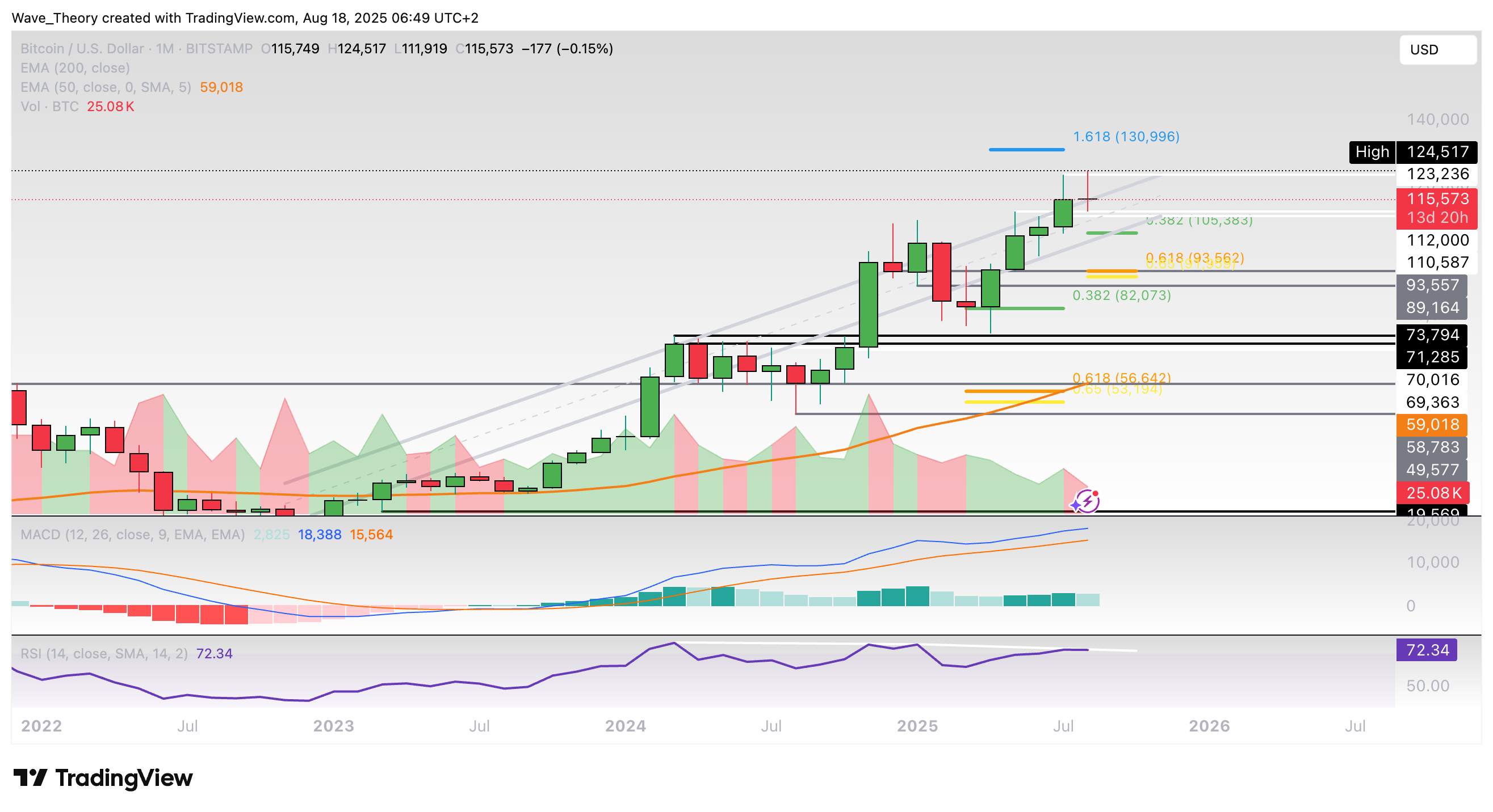 Das bullische Kursziel am Fib Projektionslevel bei rund 131.000 USD konnte Bitcoin noch nicht erreichen. Stattdessen hat der Kurs ein ATH bei rund 124.500 USD aufgestellt.