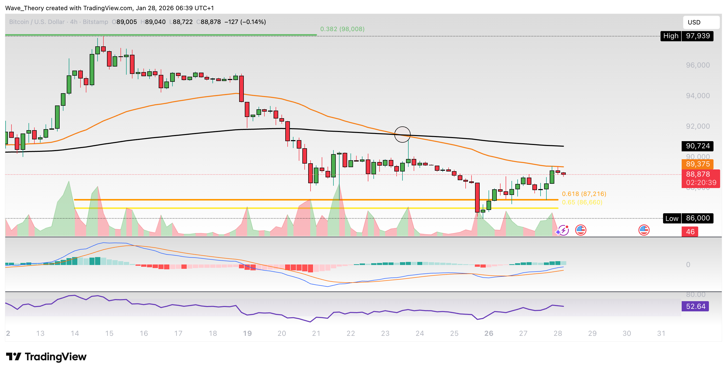Der RSI bewegt sich dabei in neutralem Raum und gibt keine eindeutigen Signale. Derzeit stößt der Kurs am 50-4H-EMA Widerstand bei rund 89.375 USD auf Widerstand.