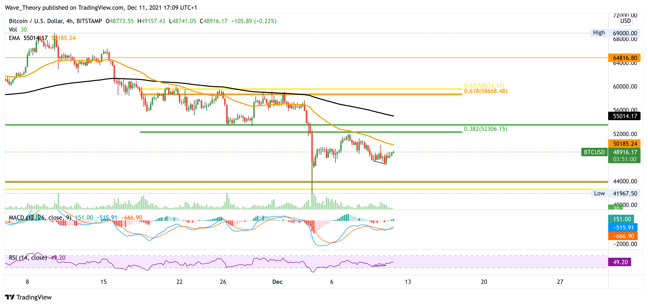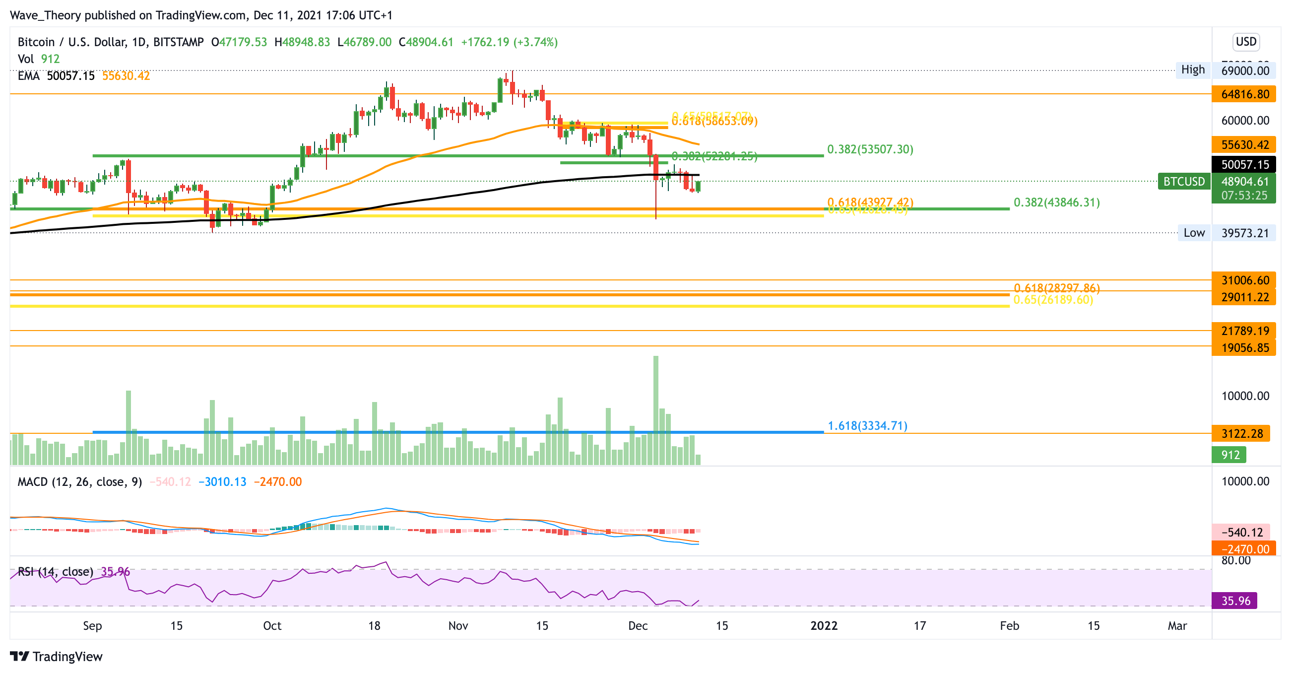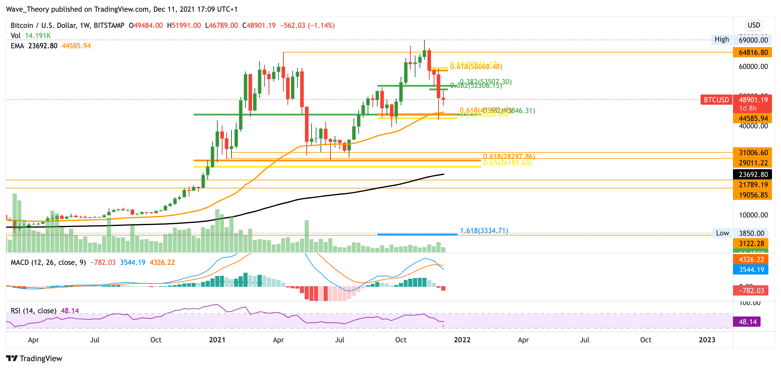 Sollte die Unterstützung bei 43.000 USD brechen, könnte sich der BTC Kurs zur 30.000 USD Marke zurückbewegen. Dort stößt er auf massive Unterstützung. Im Monatskurs zeigt sich der MACD auch eher bärisch. Sofern Bitcoin aber das Fib Niveau bei 52.300 USD bricht, gibt es reale Chancen auf eine bullische Trendwende.