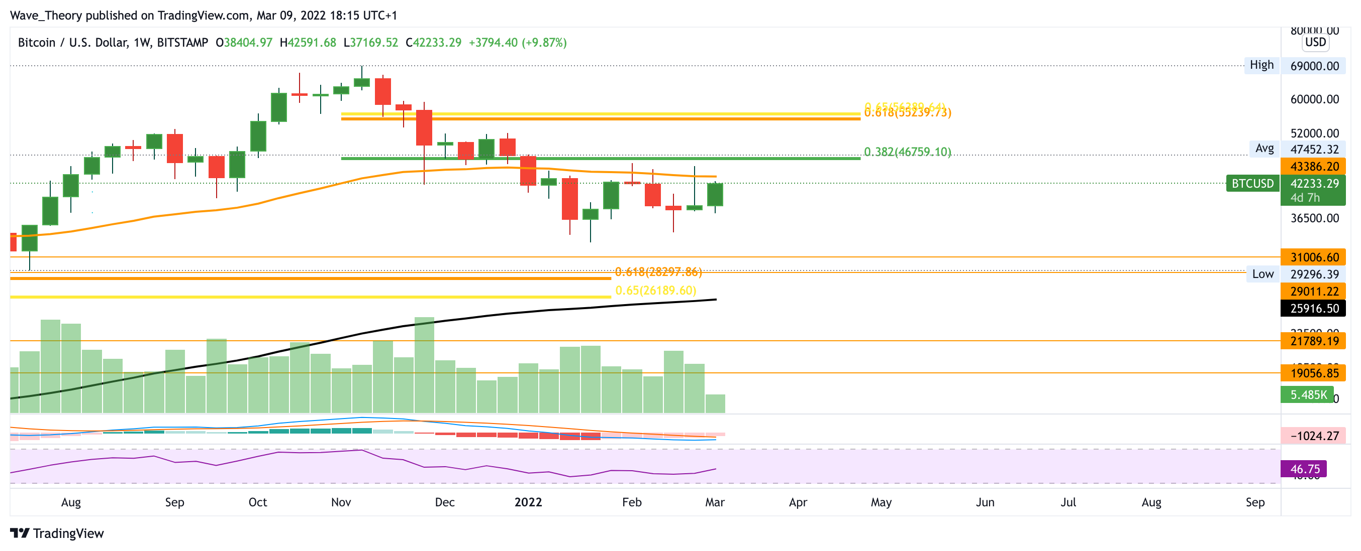 Die letzte Woche verlief recht bärisch für den Bitcoin Kurs. Zwar schloss der Bitcoin Preis höher als er in der letzten Woche startete, jedoch wurde Bitcoin stark am 50-Wochen-EMA bei rund 43.000 USD abgewiesen. Die neue Woche beginnt der BTC Kurs aber sehr bullisch und BTC könnte es dieses Mal schaffen, den 50-Wochen-EMA Widerstand zu brechen. Dann findet Bitcoin bei rund 47.000 USD am 0,382 Fib Niveau den nächsten signifikanten Widerstand.