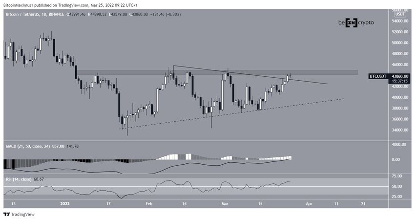 Der Bitcoin Kurs folgte seit dem 24. Januar 2022 einer aufsteigenden Support-Linie. Am 14. März validierte der BTC Kurs diese zum letzten Mal als Unterstützung, bevor die aktuelle Aufwärtsbewegung begonnen hat.