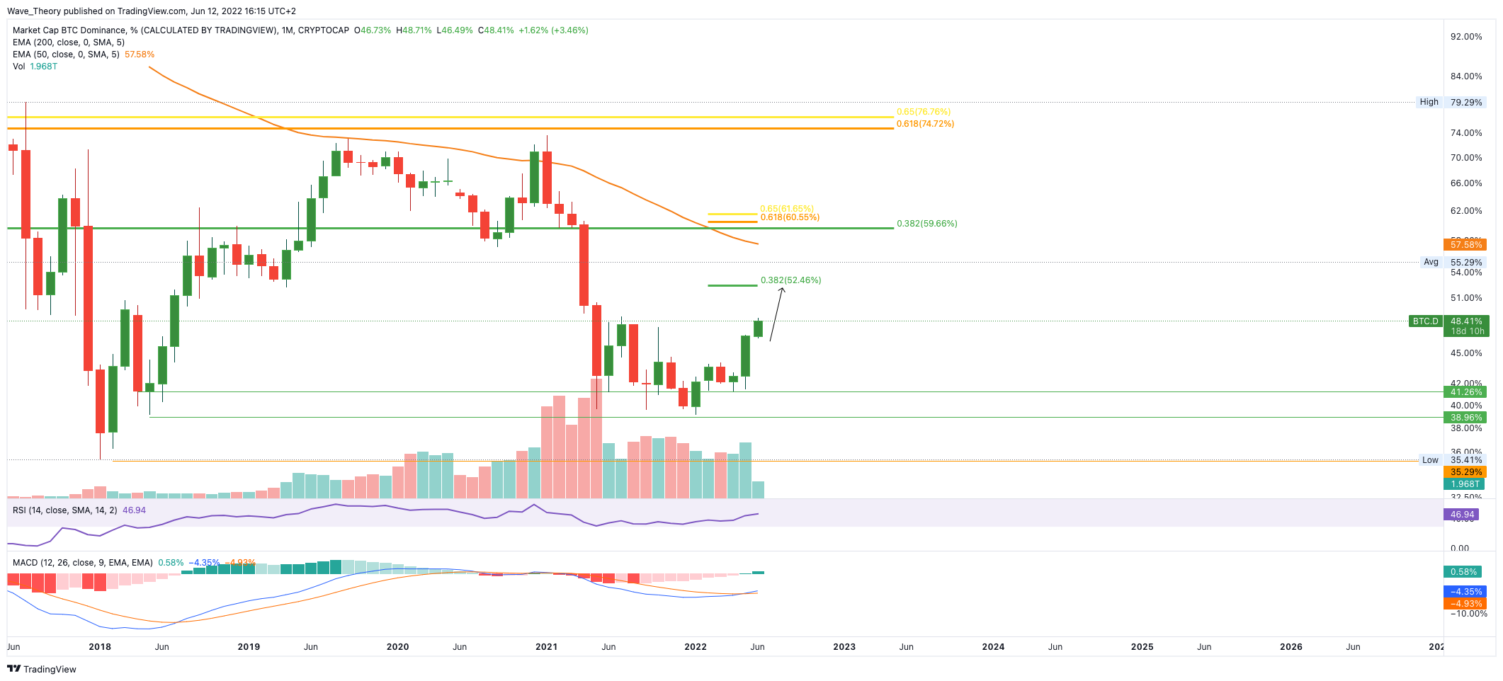 Das spiegelt sich auch in Bitcoins Marktdominanz wieder, denn der Marktanteil von Bitcoin steigt weiterhin an. Das Kursziel liegt am 0,382 Fib Niveau bei rund 52 % und sollte Bitcoin diesen Widerstand brechen, könnte Bitcoin sogar einen Marktanteil von rund 60 % einnehmen.