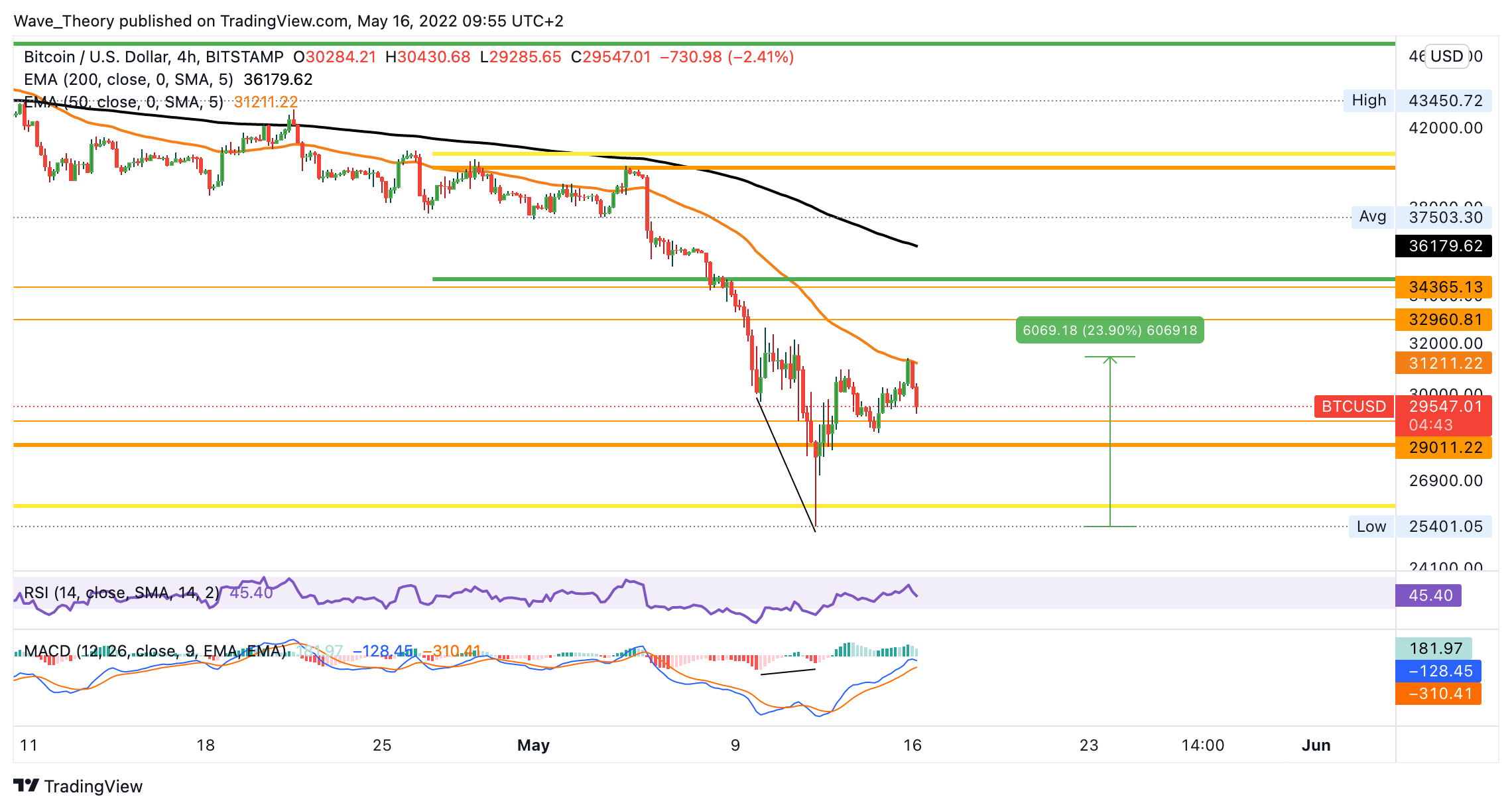 Bisher konnte der Bitcoin Kurs kräftig an der Golden Ratio Unterstützung zwischen 26.000 – 29.000 USD abprallen. Insgesamt konnte der BTC Kurs bereits einen Kursanstieg von rund 24 % verbuchen, seit BTC einen Tiefpunkt bei 25.401 USD etablierte. Jedoch wurde BTC nun am 50-4H-EMA bei rund 31.200 USD abgewiesen, woraufhin Bitcoin zur Unterstützung zwischen 26.000 – 29.000 USD zurückkehren könnte.