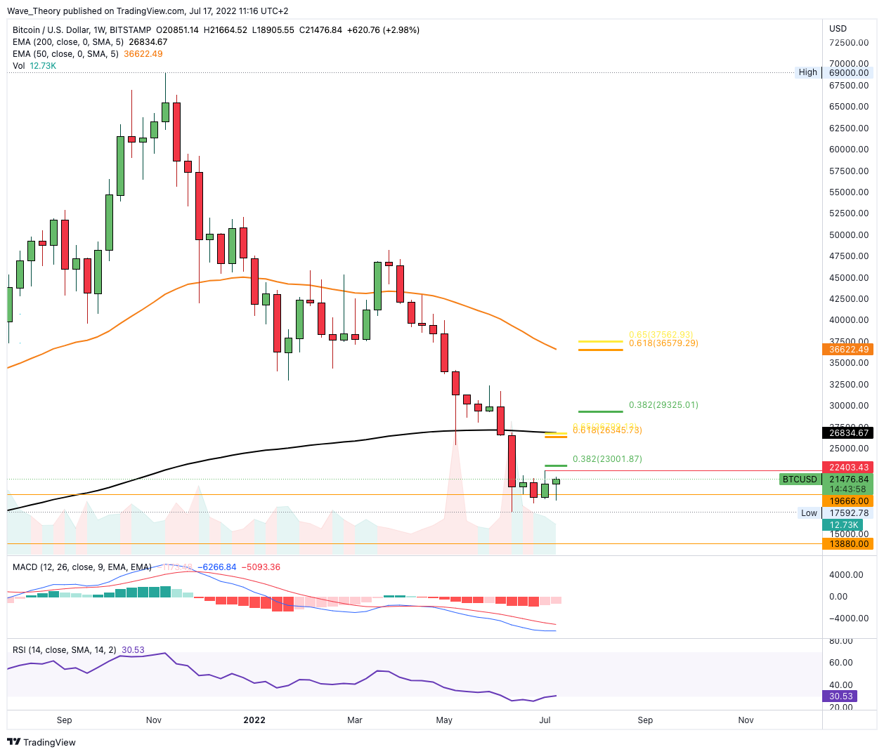 Hinsichtlich der bullischen Entwicklung in dieser Woche, steigt aktuell die Chance, dass Bitcoin zwischen 14.000 – 20.000 USD seinen Boden gefunden hat. Schließlich könnte Bitcoin die nächsten Wochen bis Monate stark steigen, sofern Bitcoin das 0,382 Fib Niveau bei rund 23.000 USD bricht. Sollte Bitcoin sogar die Golden Ratio bei rund 26.800 USD brechen, wartet bei rund 37.000 USD signifikanter Fib Widerstand.