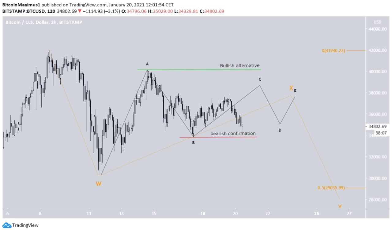 Sponsored SponsoredSobald die Formation abgeschlossen ist, müssen wir mit einer weiteren Korrektur rechnen. Sollte der Bitcoin-Preis deutlich unter den Tiefpunkt der B-Welle bei 33.833 USD (unten in Rot eingezeichnet) fallen, dann ist dieses Szenario äußert wahrscheinlich.
