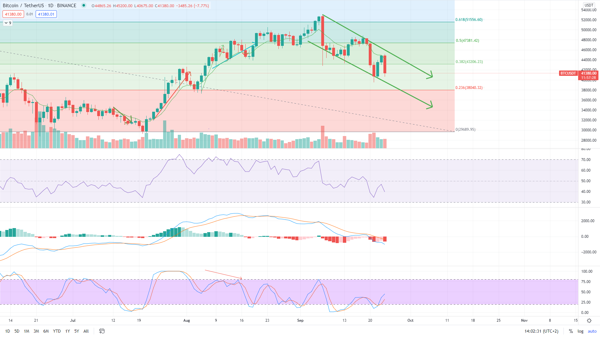 Der Bitcoin Kurs befindet sich seit dem Hochpunkt vom 9. September 2021 in einer Abwärtsbewegung. Die technischen Indikatoren sehen ebenfalls tendenziell bärisch aus. Der Bitcoinpreis wird kurzfristig gesehen wohl erstmal innerhalb des absteigenden, parallelen Channels fallen und dann möglicherweise über diesen ausbrechen. Die nächsten beiden Support-Level liegen bei der psychologischen Marke von 40.000 USD und bei 38.000 USD (dem 0.236-Fib-Retracement-Level). Sollten diese Level nicht halten, dann könnte der BTC Kurs bis auf 30.000 USD fallen.