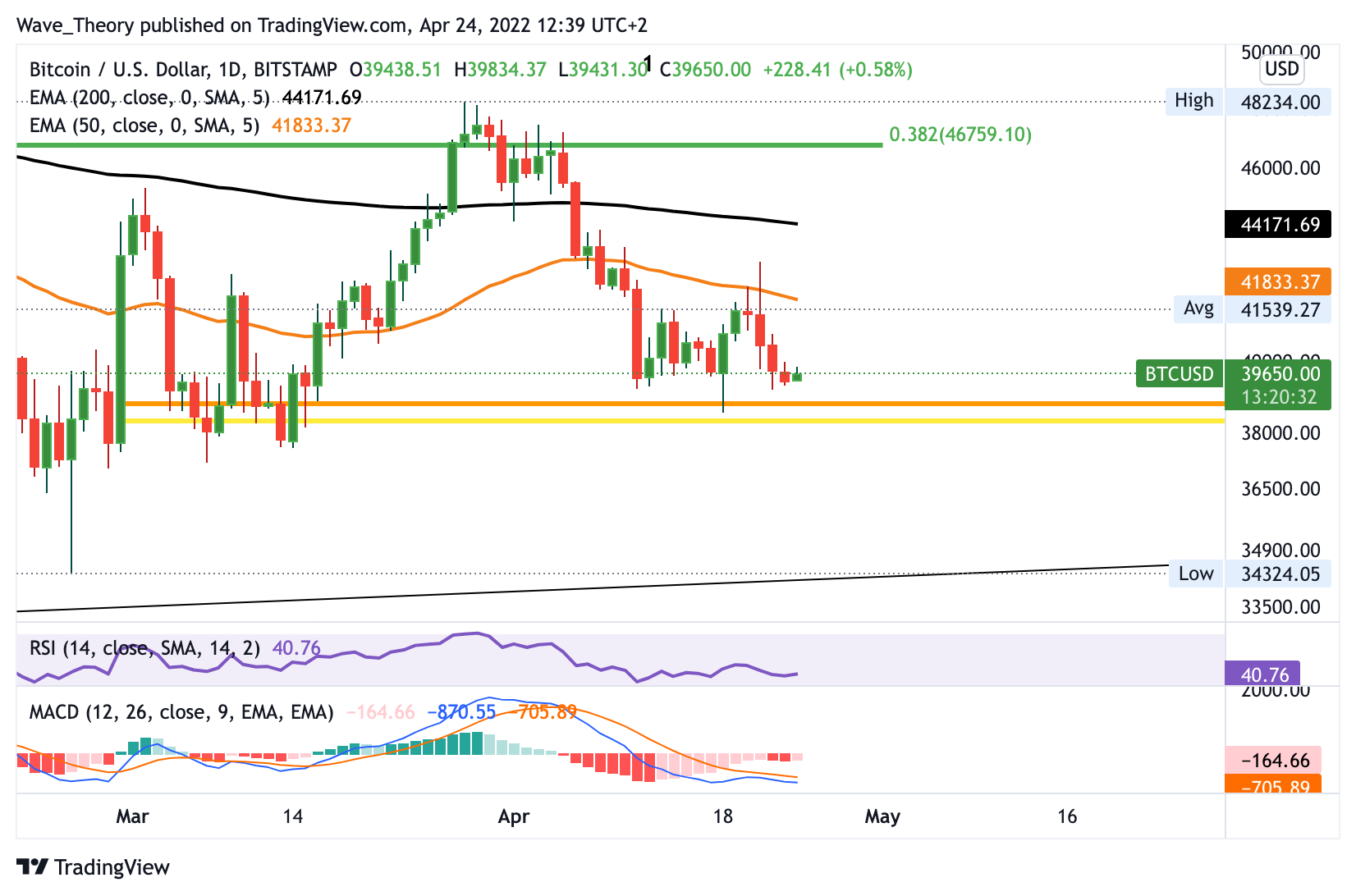 Auch im Tageschart sind die MACD Linien bärisch überkreuzt, jedoch tickt das Histogramm am heutigen Tage bullisch höher. Nachdem BTC aber an der Golden Ratio Unterstützung bei rund 39.000 USD abgeprallt war, konnte er den 50-Tage-EMA Widerstand bei 41.833 USD nicht brechen. Auch die EMAs befinden sich noch immer in einem bärischen Death Cross. Aktuell sieht es also nicht besonders bullisch für den BTC Kurs aus, jedoch besteht immer noch die Chance, dass die Golden Ratio Unterstützung bei rund 39.000 USD erfolgreich halten kann.